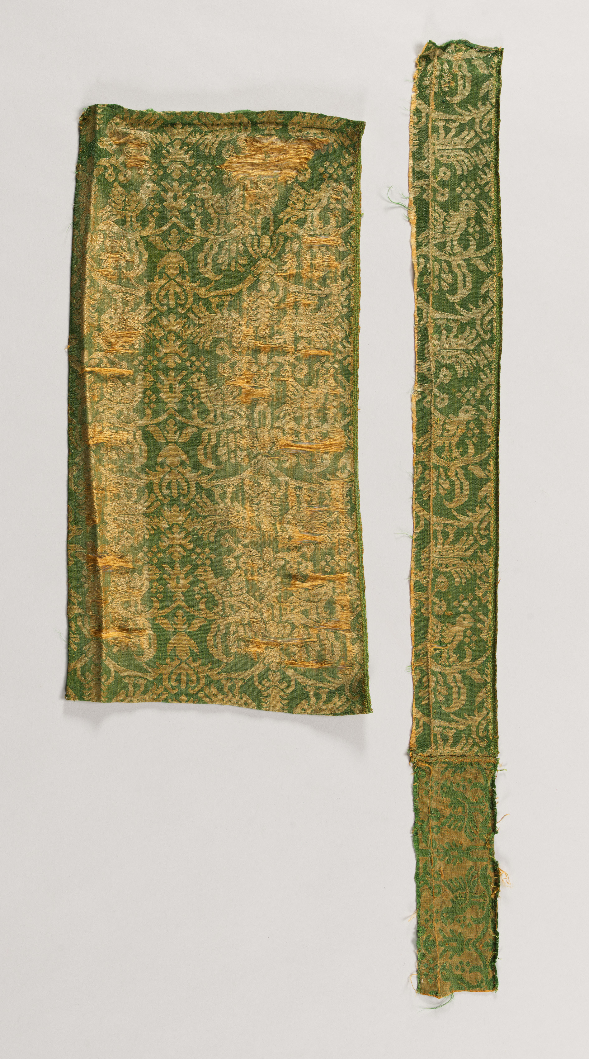 Green fabric with gold-colored designs. Two pieces, one rectangular about twice as wide as the other, placed side by side. The larger piece on the left measures approximately two times the width of the piece on the right. Both pieces have frayed edges. The designs on the fabric include leaves, flowers, and geometric patterns. The background of the image is light gray. Fragments of Silk.