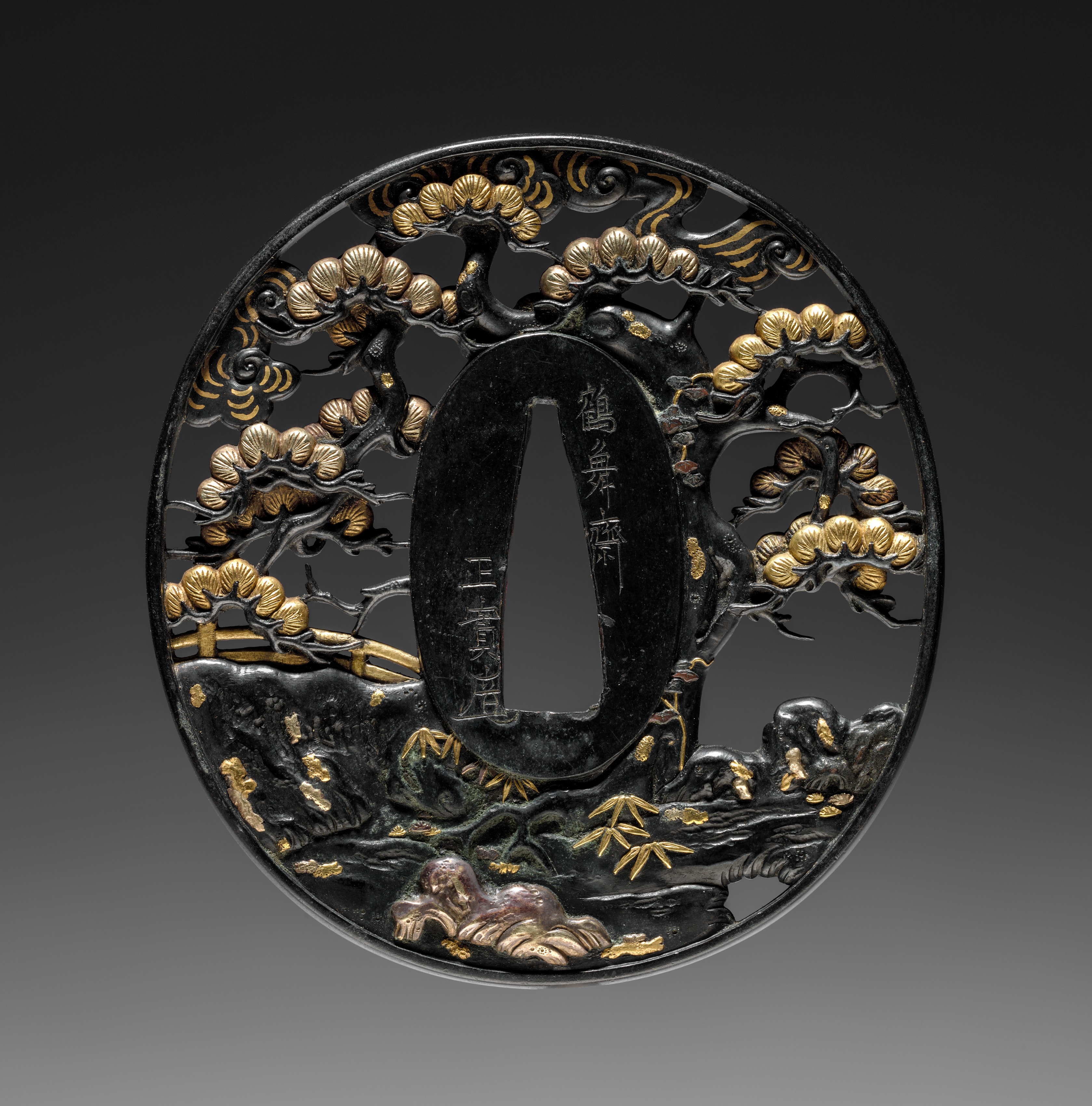 Black metal sword guard, round with oblong hole in center; gold and silver designs of pine tree on rocky outcropping with bridge.