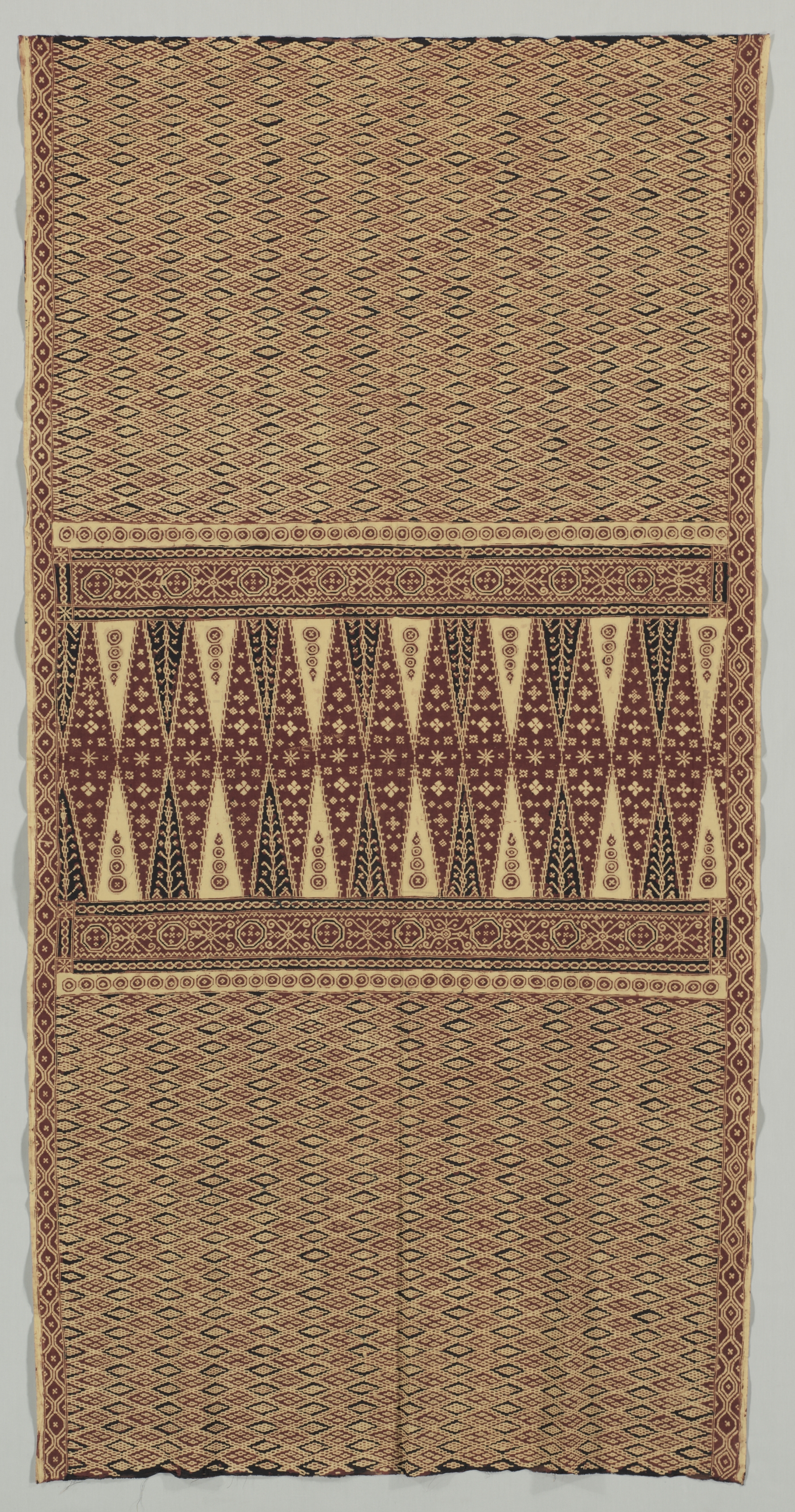 The image shows a rectangular textile titled "Sarong". The textile has a beige background with intricate patterns throughout. The top and bottom sections of the textile are covered in beige and black geometric patterns resembling diamonds. The top and bottom edges have a border with geometric shapes in shades of beige, brown, and black. The middle section features a wide decorative band with a repeating pattern of triangles in brown, beige, and green. The triangles are arranged in a row and point downwards. The middle section's decorative band is bordered by thin strips with geometric patterns. The background behind the textile is light gray.
