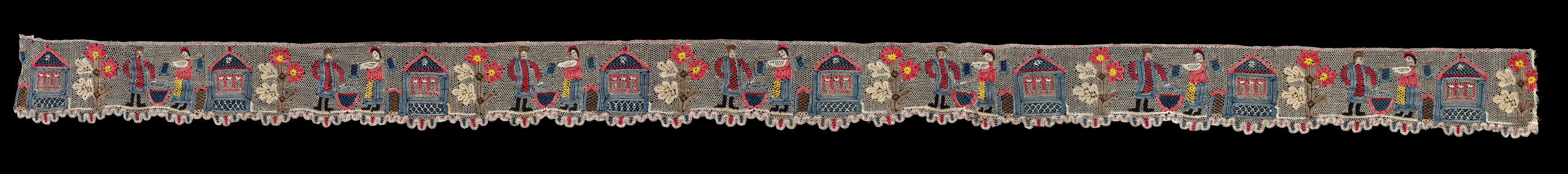 The image shows a long, narrow textile with a repeating pattern, titled "Figurative Border" by an unknown artist. The textile has a scalloped edge at the top and bottom. The pattern consists of alternating images of houses and people. The houses are blue with red windows and doors, and some have smoke coming out of the chimney. The people are wearing colorful clothing and hats, and some are holding objects. The background of the textile is gray. The entire textile is set against a black background.