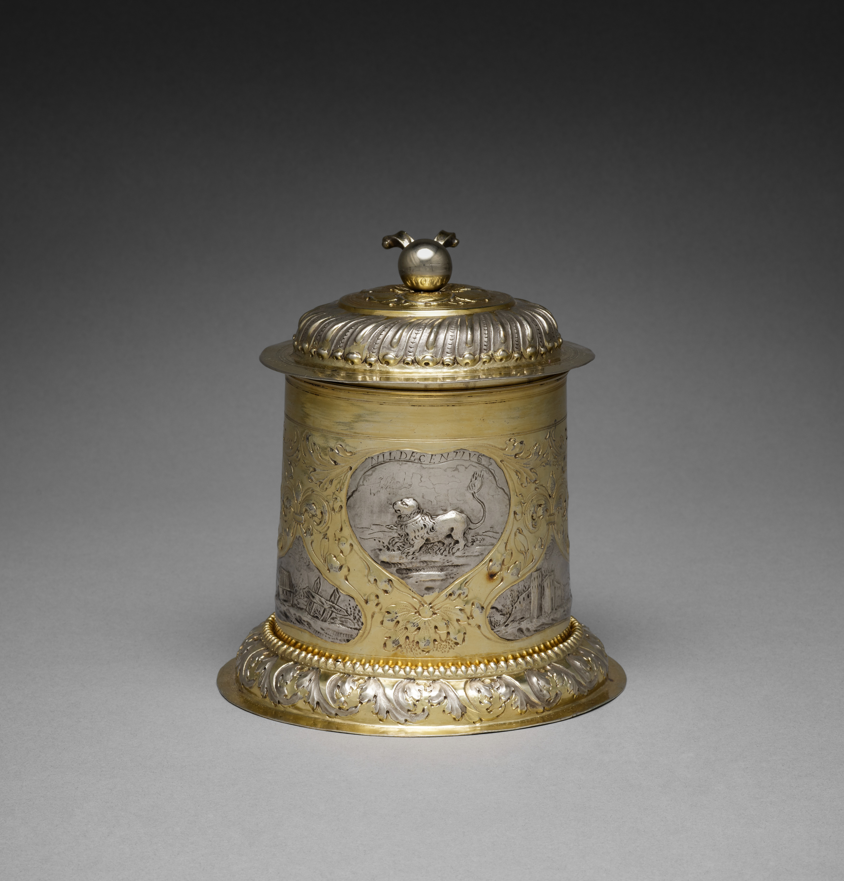 Gold-colored metal container with a wide base and lid. The base has a decorative design around the edge. The middle section has a heart-shaped silver plate with a lion and a landscape. The lid is decorated with ridges and a small silver sphere on top. The background is gray. The container is titled "Tankard".