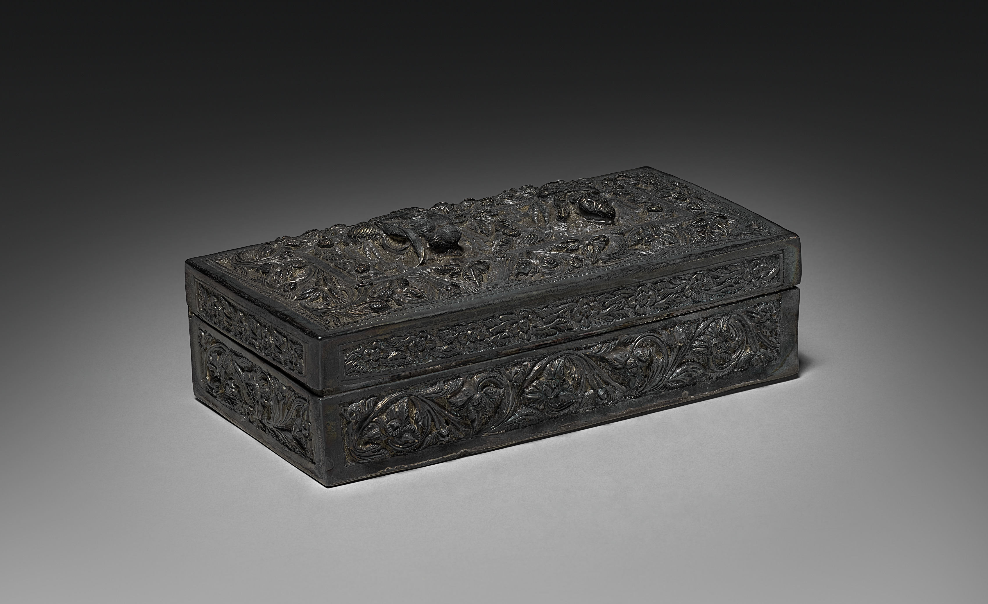 Rectangular Box by unknown artist. The image shows a rectangular box with a flat top and straight sides. The box is made of dark-colored material, possibly metal or stone, and has an intricate design carved into its surface. The top of the box features a raised design with curved shapes and patterns. The sides of the box also have carved designs, including floral patterns and other shapes. The box is positioned at an angle, with the front-right corner closest to the viewer. The background of the image is a gradient of dark to light gray.