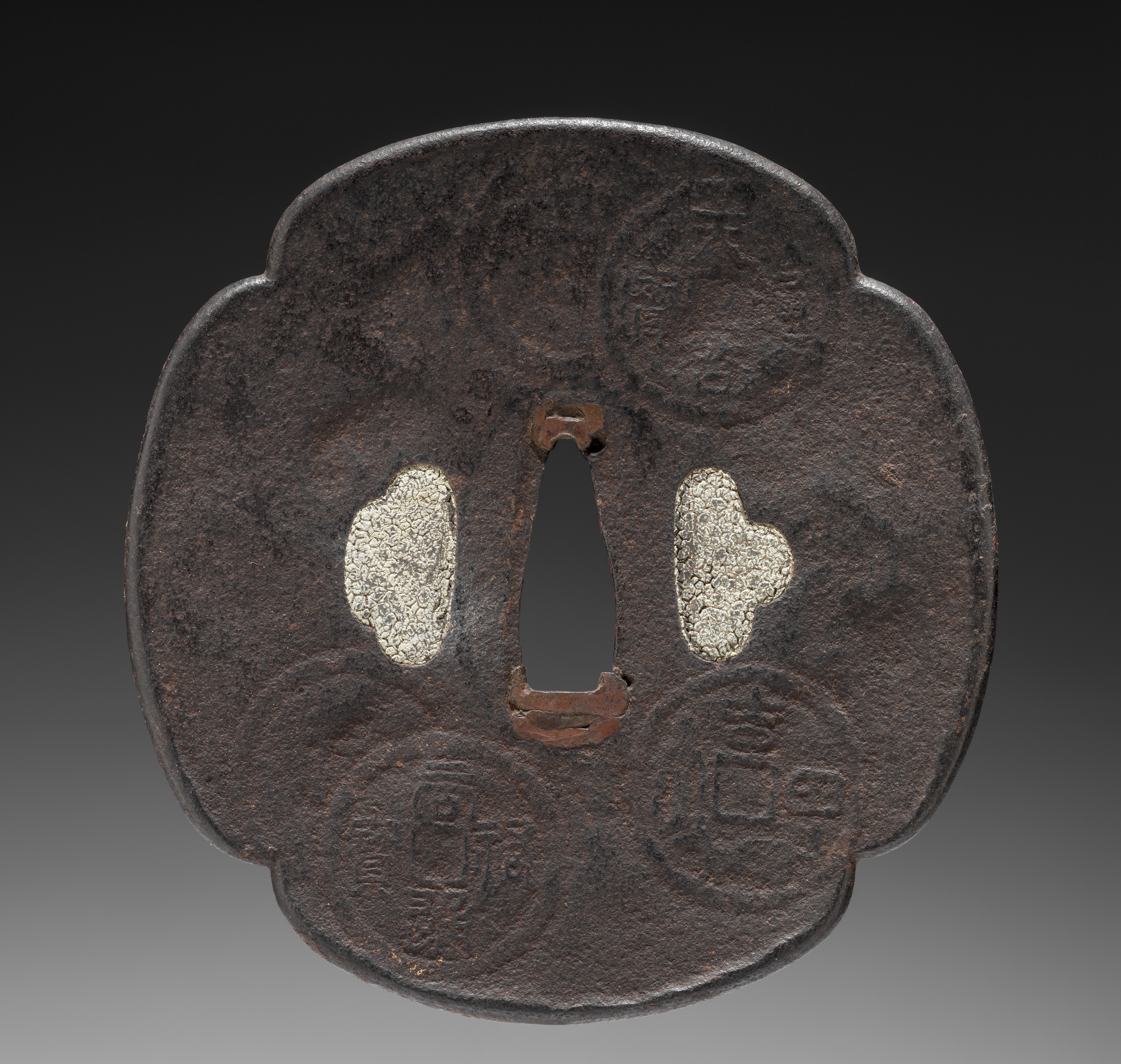 Dark brown metal sword guard with a distinctive shape resembling a flower or a quatrefoil; the guard has a central slot; two rounded rectangular cutouts on either side of the central slot; two circular inlays made of a lighter-colored metal; the guard appears to be made from a textured, rough material; the background gradient transitions from black to gray. Sword Guard (Tsuba) with Coins.