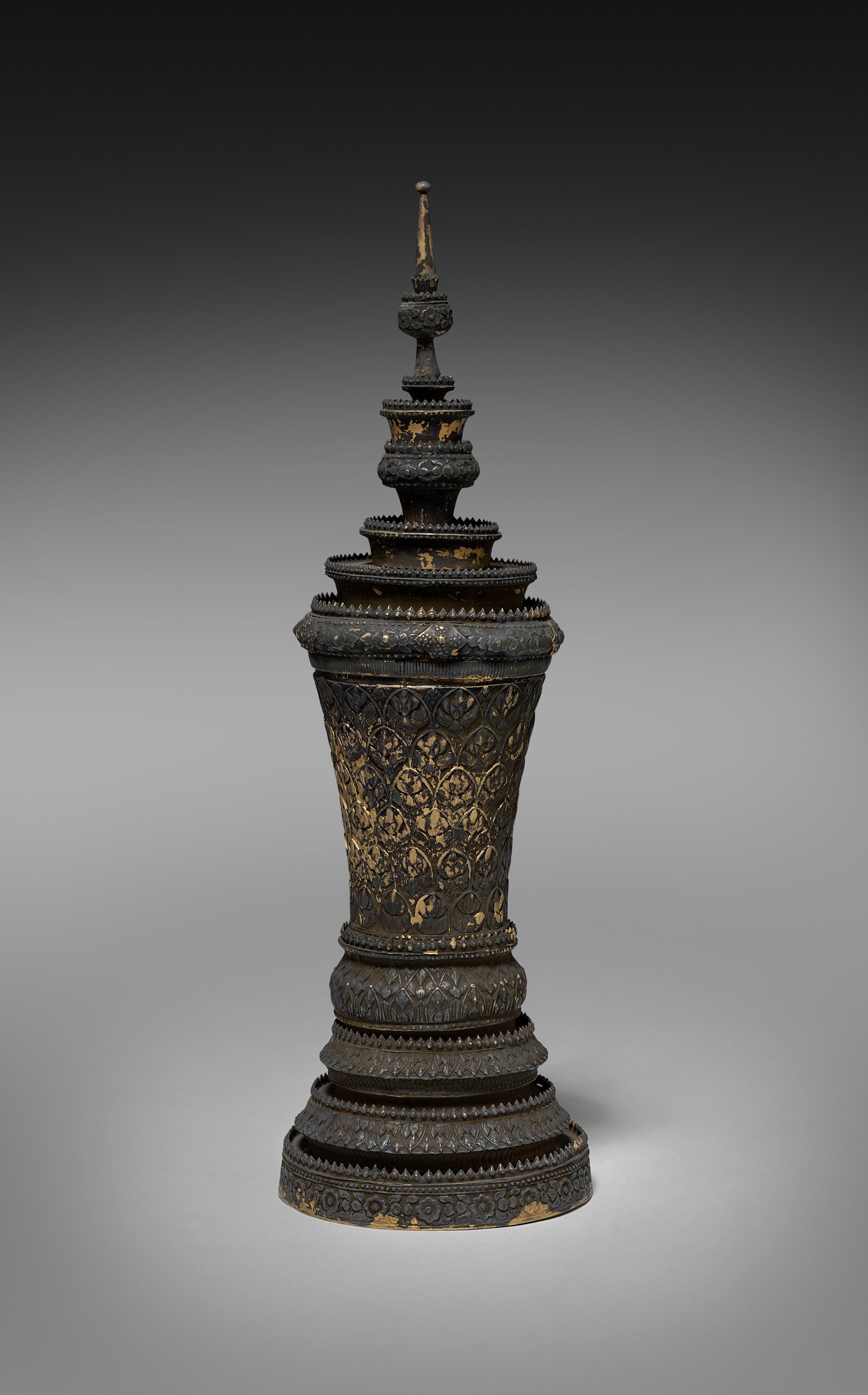 The Burial Urn by Unknown Artist is a tall, dark-colored metal object with gold accents. The object has a wide base that tapers upwards, with multiple stacked rings and ridges around its body. The base is wide and flat, with a decorative edge. The body of the urn is decorated with intricate designs and patterns, including gold accents. The urn has a series of stacked, tiered sections that form the lid, with a small finial on top. The background of the image is a gradient of gray, with the object casting a shadow on the surface below. The object appears to be made of metal, possibly bronze or brass, and has a weathered appearance.