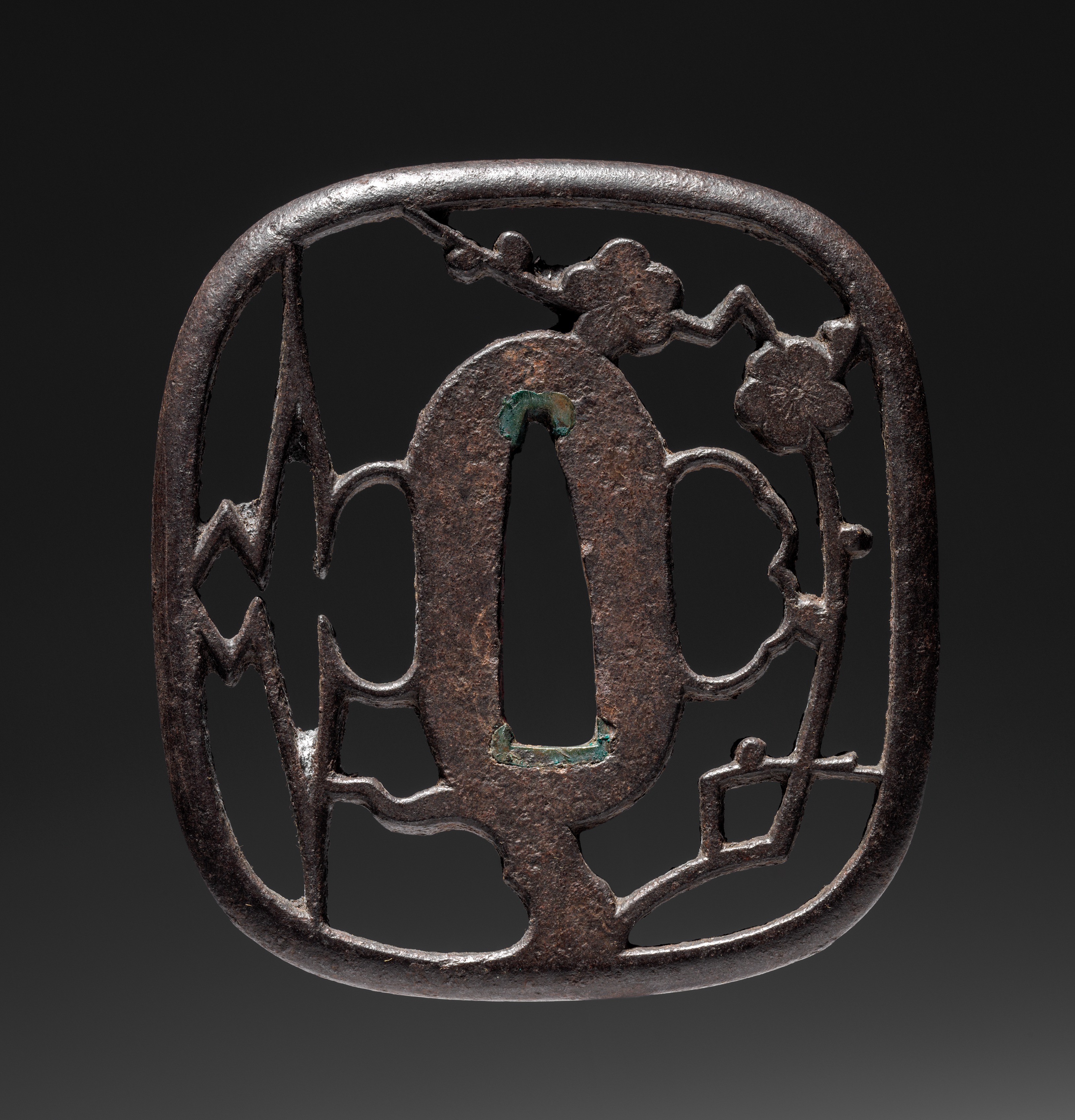 Sword Guard by artist unknown, features a dark brown, metal object with a rounded rectangular shape and a central oval cutout. The object has a textured surface and a small patch of green on the bottom left of the oval cutout. The object is adorned with a design featuring curved lines and shapes resembling flowers or leaves. The background is dark gray, with a lighter gray gradient at the bottom.