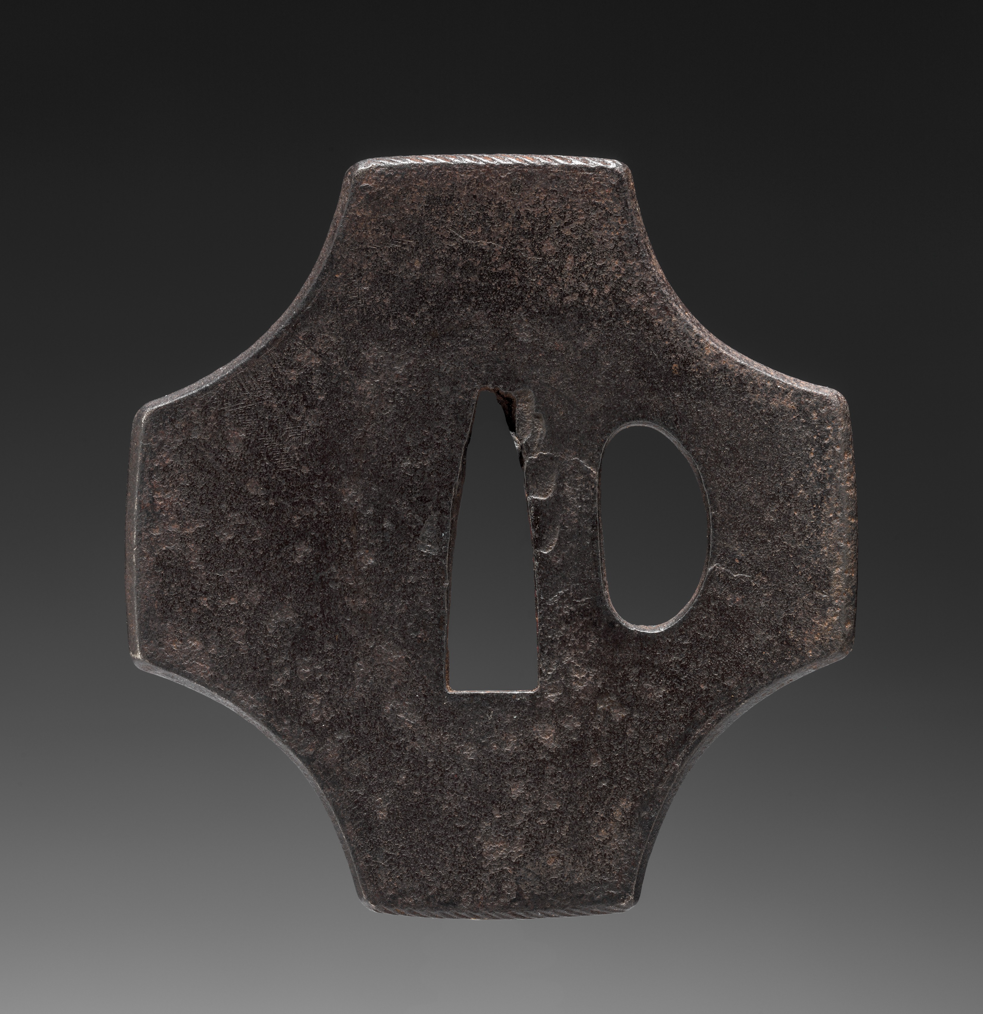 The sword guard, or Tsuba, is a dark brown to black color with visible signs of wear and aging. The object has a distinctive shape with a central body that tapers towards the top and four curved protrusions, one on each side, forming a cross-like shape. The central body features two cut-out sections: a long, narrow, triangular shape on the left and a smaller oval shape on the right. The surface of the sword guard exhibits a textured appearance with darker and lighter brown patches, indicating age and use. The background of the image transitions from dark at the top to light gray at the bottom. The artist of this piece is not visually identifiable in the image.