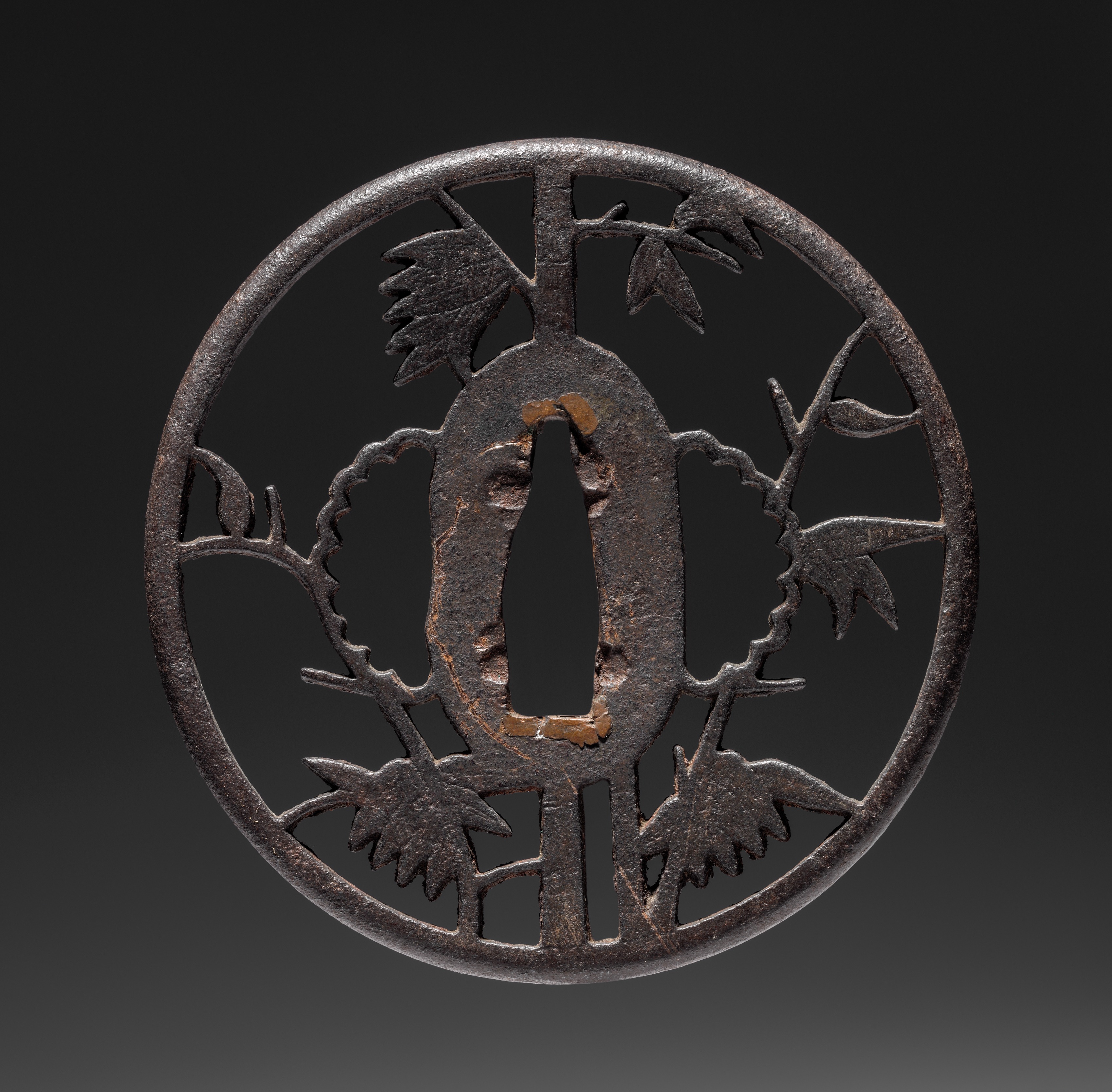 The image shows a circular, dark brown metal object with a design. The object is a sword guard with a central oval-shaped hole. The guard features a design of bamboo plants with leaves. The object is circular and made of dark brown metal. The central oval-shaped hole is surrounded by a design of bamboo plants with leaves. The bamboo plants are depicted in a stylized manner, with curved lines and teardrop-shaped leaves. The background of the image is black, which helps to highlight the details of the object. The object is titled "Sword Guard (Tsuba) with Bamboo" by an unknown artist.