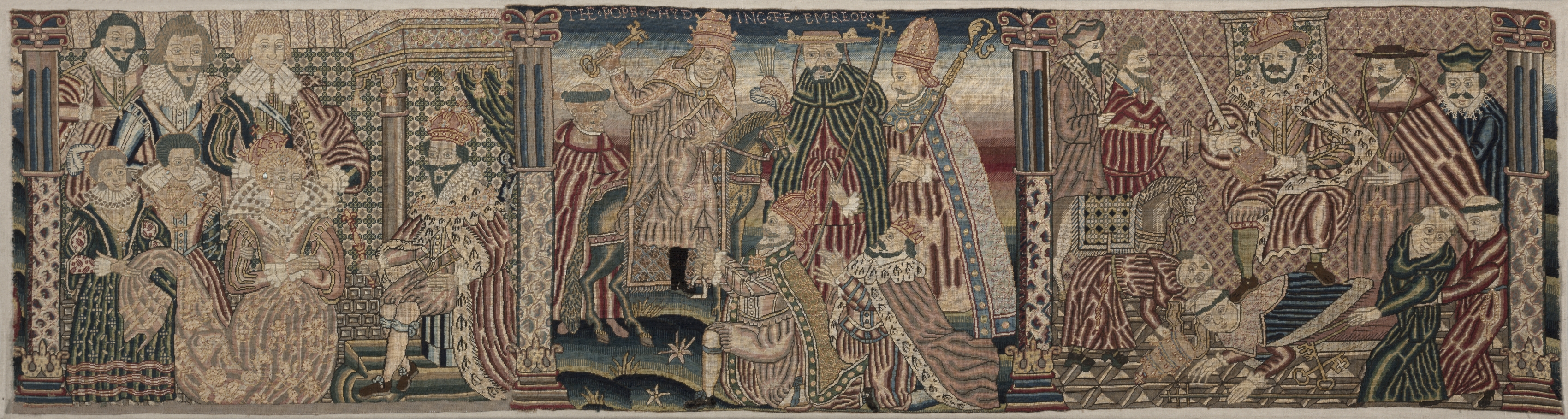 Embroidered frieze divided into three sections. Left section depicts Ahasuerus and Esther with four other figures; Ahasuerus sits on a throne with Esther standing before him, wearing a long dress and a large headdress. Middle section shows The Pope Chiding the Emperor; the Pope stands with his right hand raised, wearing a mitre and holding a staff, while the Emperor sits on a throne with one knee raised. Right section depicts Henry VIII treading on the Pope's neck; Henry VIII sits on a throne, with one leg raised and his foot on the Pope's neck, who is on the ground. The three scenes are separated and framed by columns. The entire frieze has intricate designs and patterns throughout. The scenes are embroidered with a variety of colors including red, blue, green, beige, and gold. The clothing and hairstyles are from 16th century Europe.
