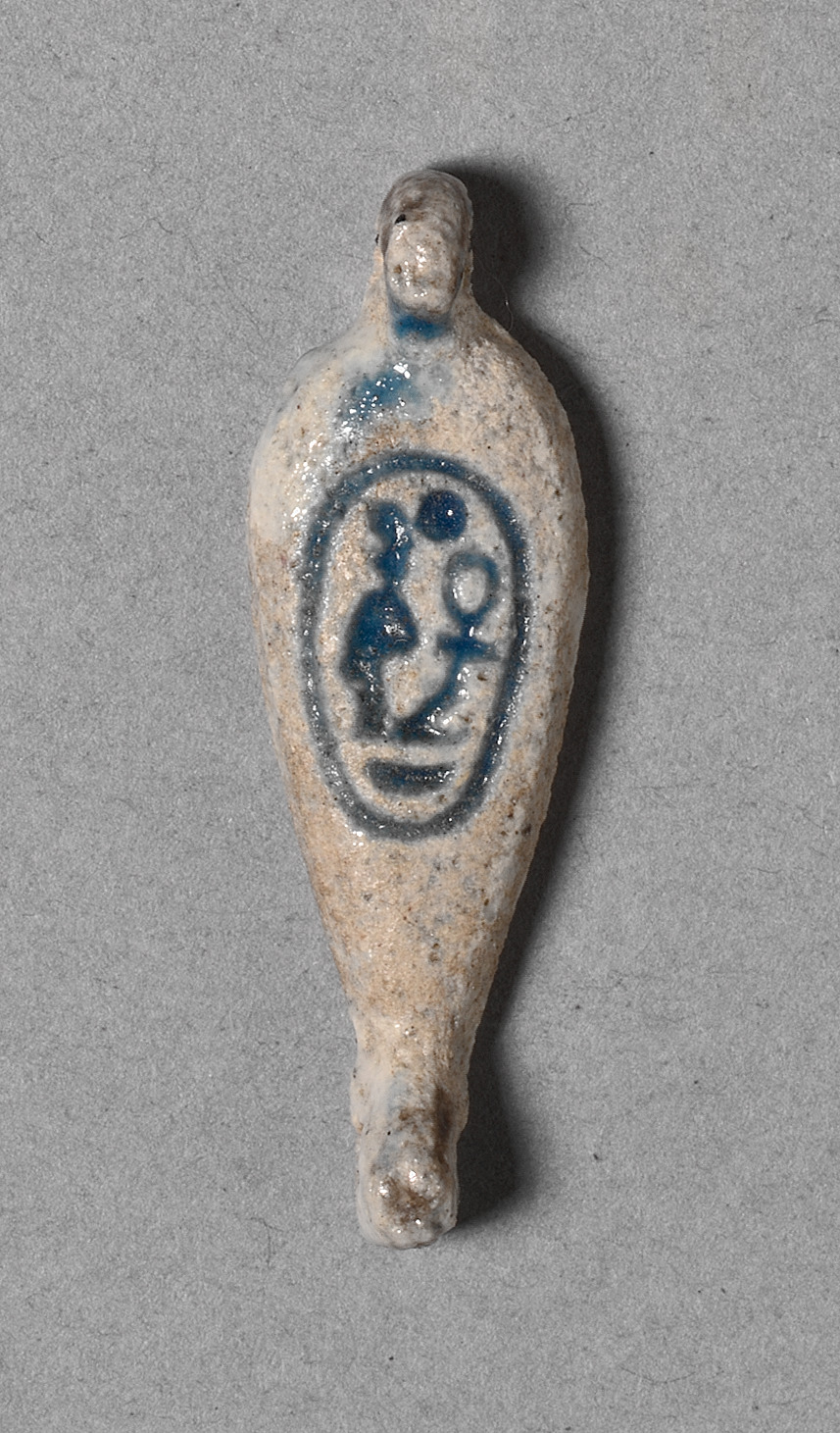 The Petal-Shaped Bead by Unknown Artist is a small, elongated, teardrop-shaped bead with a loop at the top and a smaller one at the bottom. The bead has a predominantly white and beige color with small brown and black speckles. There are blue accents on the bead; one small spot of blue is above the main design, and the main design is a blue oval with a blue hieroglyphic symbol inside. The background of the image is a solid gray color.