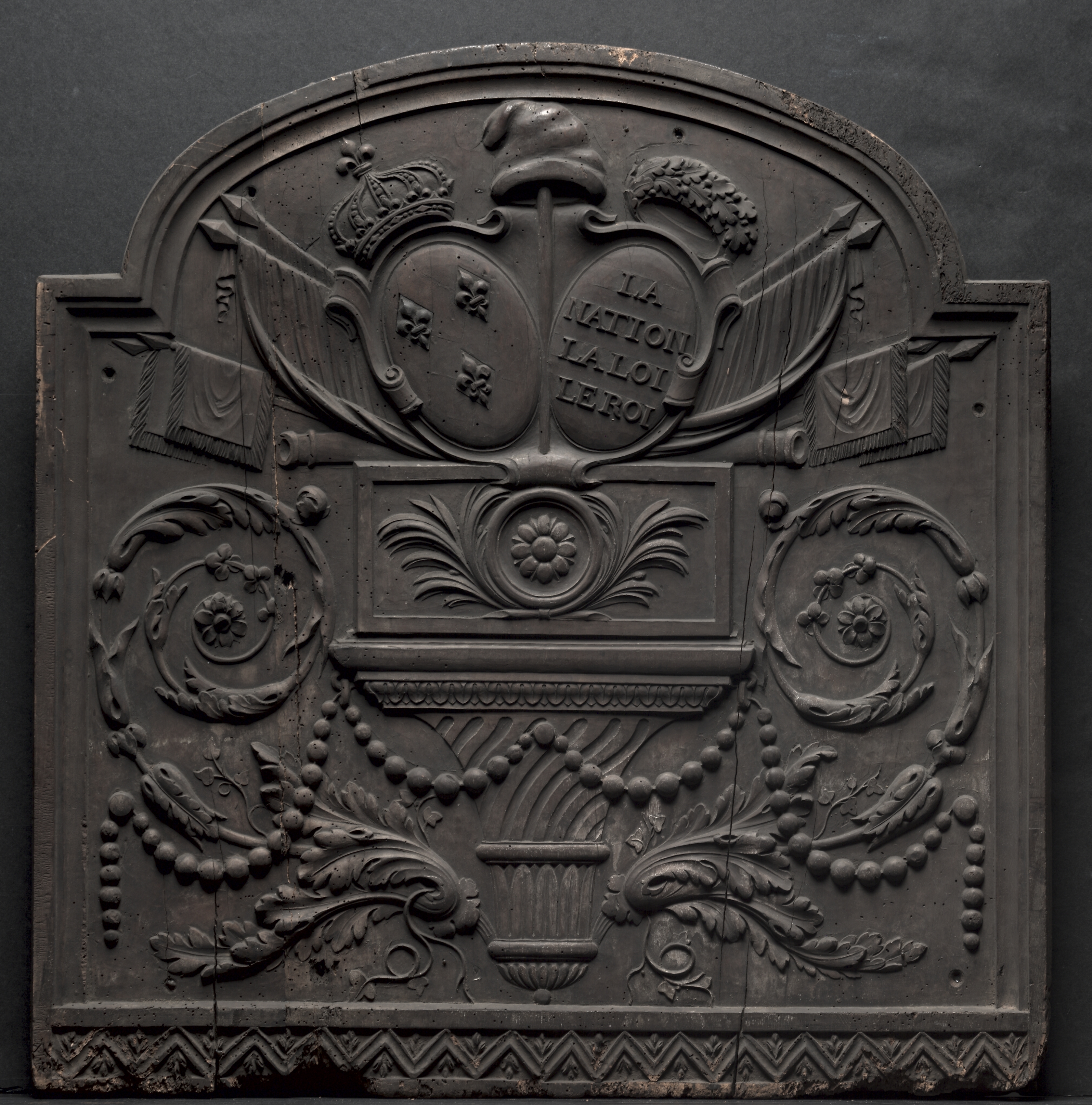 Dark brown wooden panel with carvings. Rectangular panel with rounded top and flat bottom. Top section features an oval shape with a crown and a shield divided into two sections. Left section has a fleur-de-lis symbol, right section has text "LA NATION LA LOI LE ROI". Two ribbons extend from the oval, each with tassels on the ends. Below the oval is a horizontal rectangle with a flower and leaf design. Two symmetrical circular designs with flowers and leaves flank the rectangle. A beaded design connects the circular designs to a vase at the bottom. The vase is surrounded by leaves and flowers. The bottom of the panel has a zigzag pattern. The background is dark gray. Carved Wood Panel by artist.