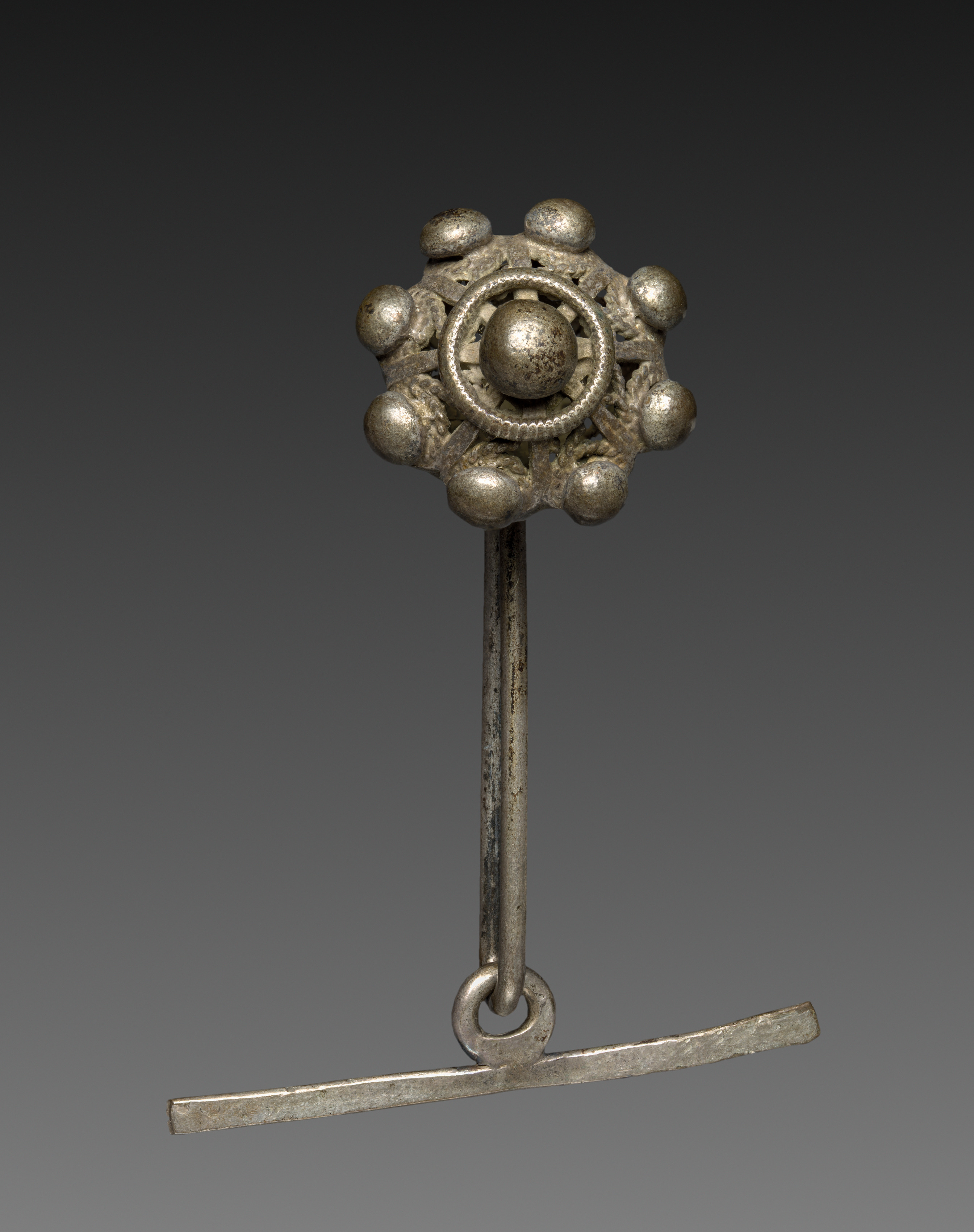 Metal brooch with a flower-like design, having a central sphere surrounded by a circle and then by 8 outer spheres; long pin extends down from the flower; pin is connected to a thin metal bar at the bottom. Button by unknown artist.