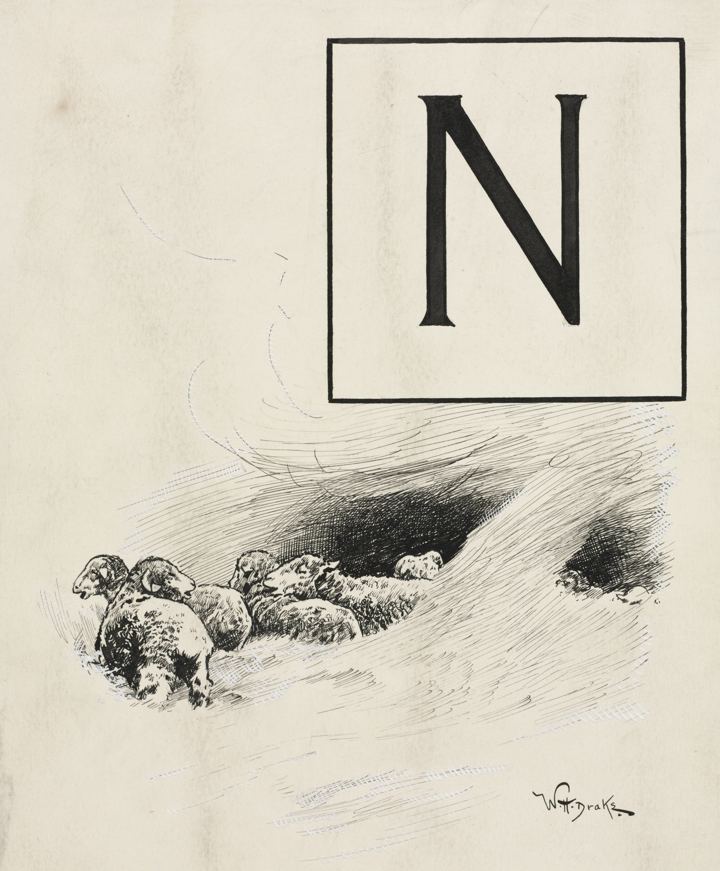 Black and white illustration of a group of sheep huddled together on the ground. The sheep are on the left side of the image. The sheep are facing to the left. The ground slopes down to the right. There is a large black and white letter "N" in a rectangular box at the top right. The background is a beige color with some darker shading. The illustration is signed in the bottom right corner. The image appears to be an initial letter for a chapter.