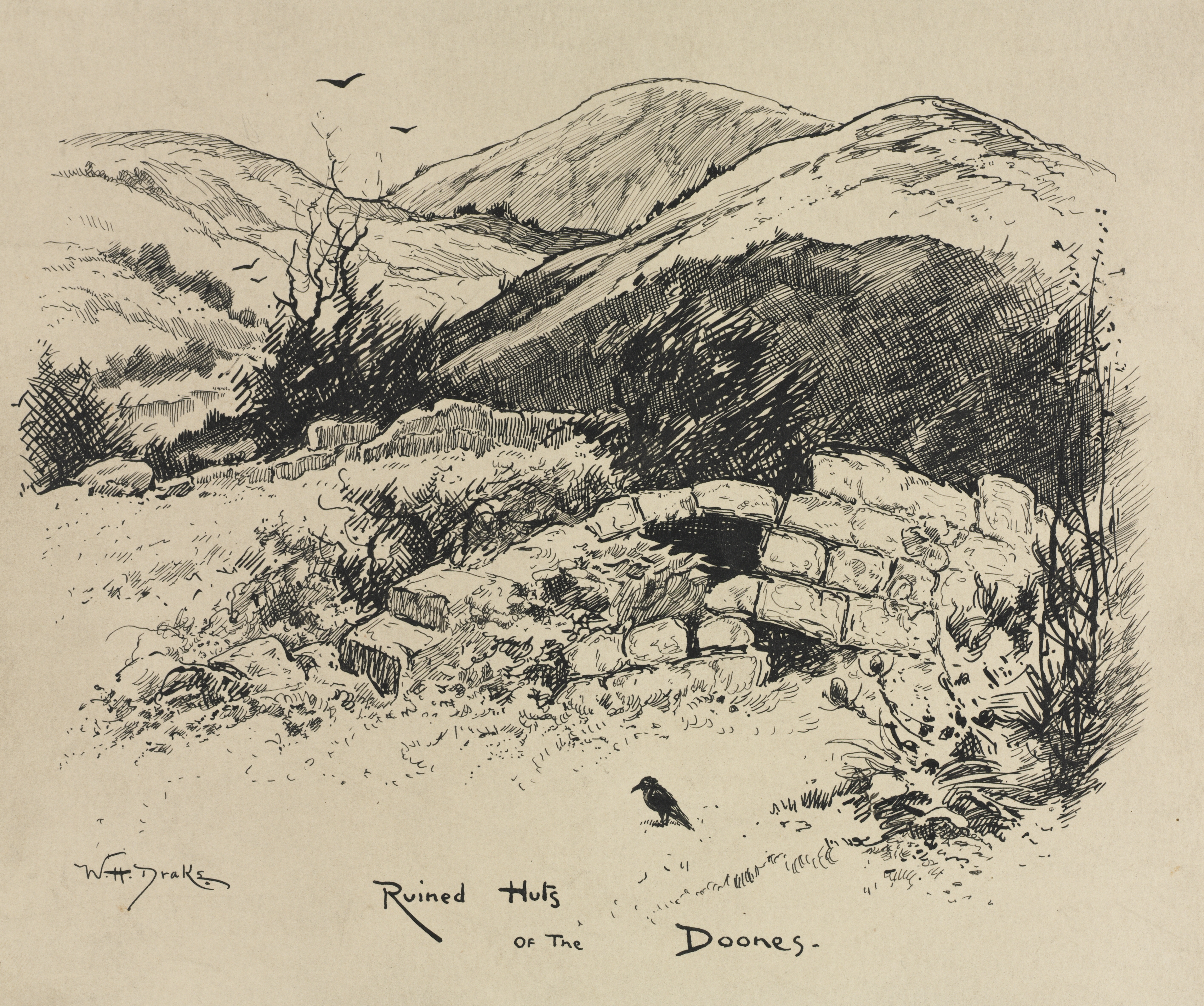 Black and white drawing of a mountainous landscape. A stone structure in the foreground with an archway. A bird on the ground in front of the archway. A bare tree to the left of the archway. More birds flying in the sky. Mountains and rolling hills in the background. The words "Ruined Huts of the Doones" are written at the bottom. The artist's signature is in the bottom-left corner.