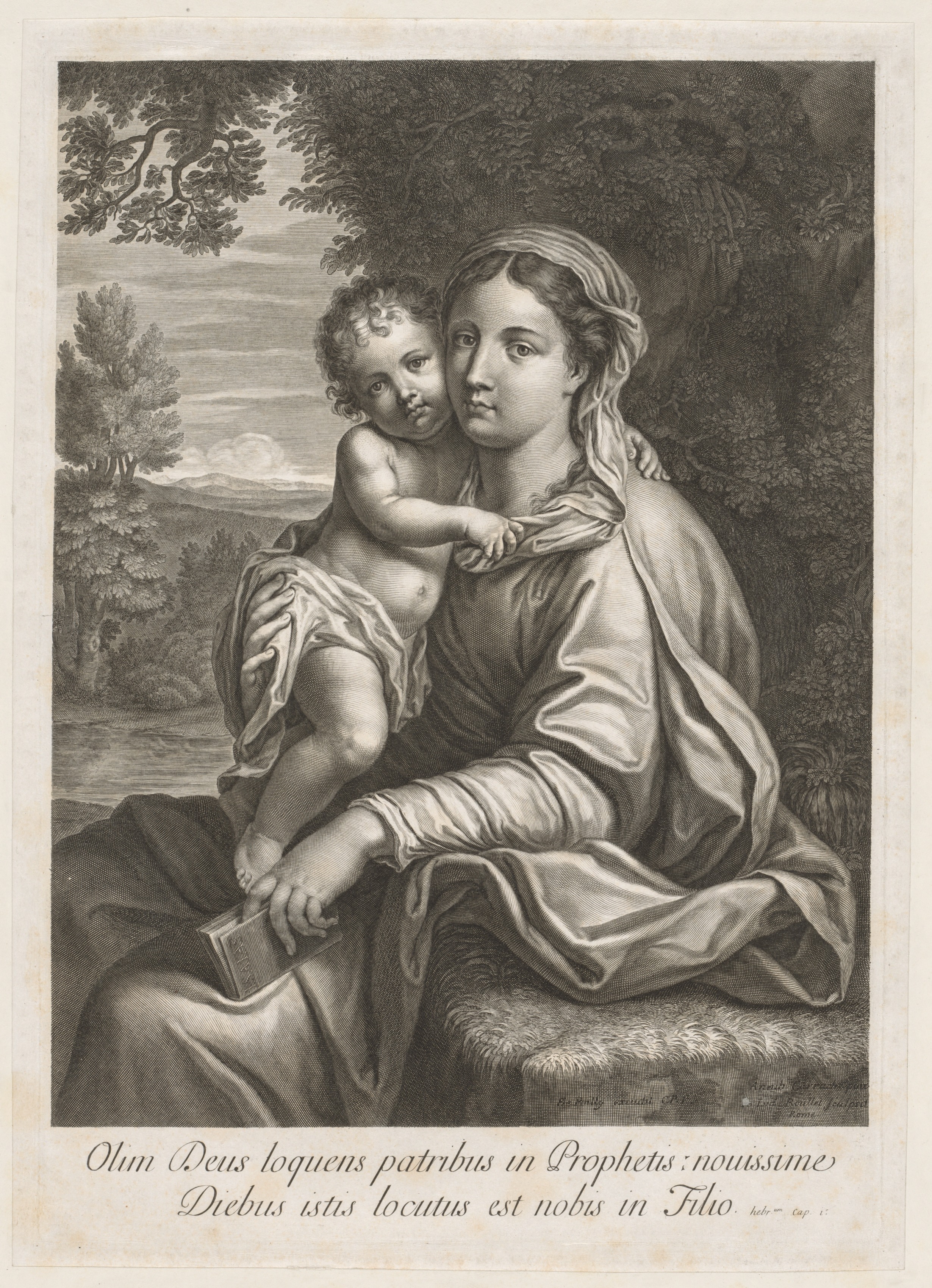 Black and white portrait of a woman and a baby. The woman is sitting and looking to her left. She has a head covering and long hair. She wears a long dress with a shiny fabric. The baby sits on her left leg and looks to his left. He wears a short cloth around his waist. The background shows trees, a body of water and mountains. There are two lines of text at the bottom. The woman's right arm supports the baby under his right arm. The woman's left hand holds a book.