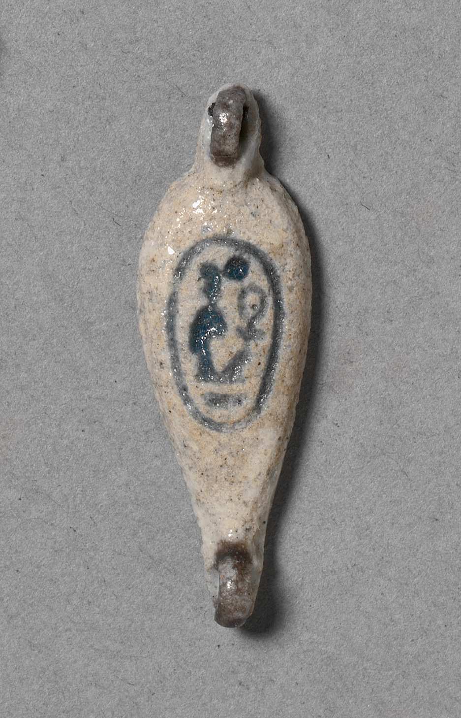 Petal-Shaped Bead by Unknown, an elongated teardrop-shaped bead with a loop at the top and bottom, primarily white with brown and black accents; featuring a black design on a white background within a circular border.