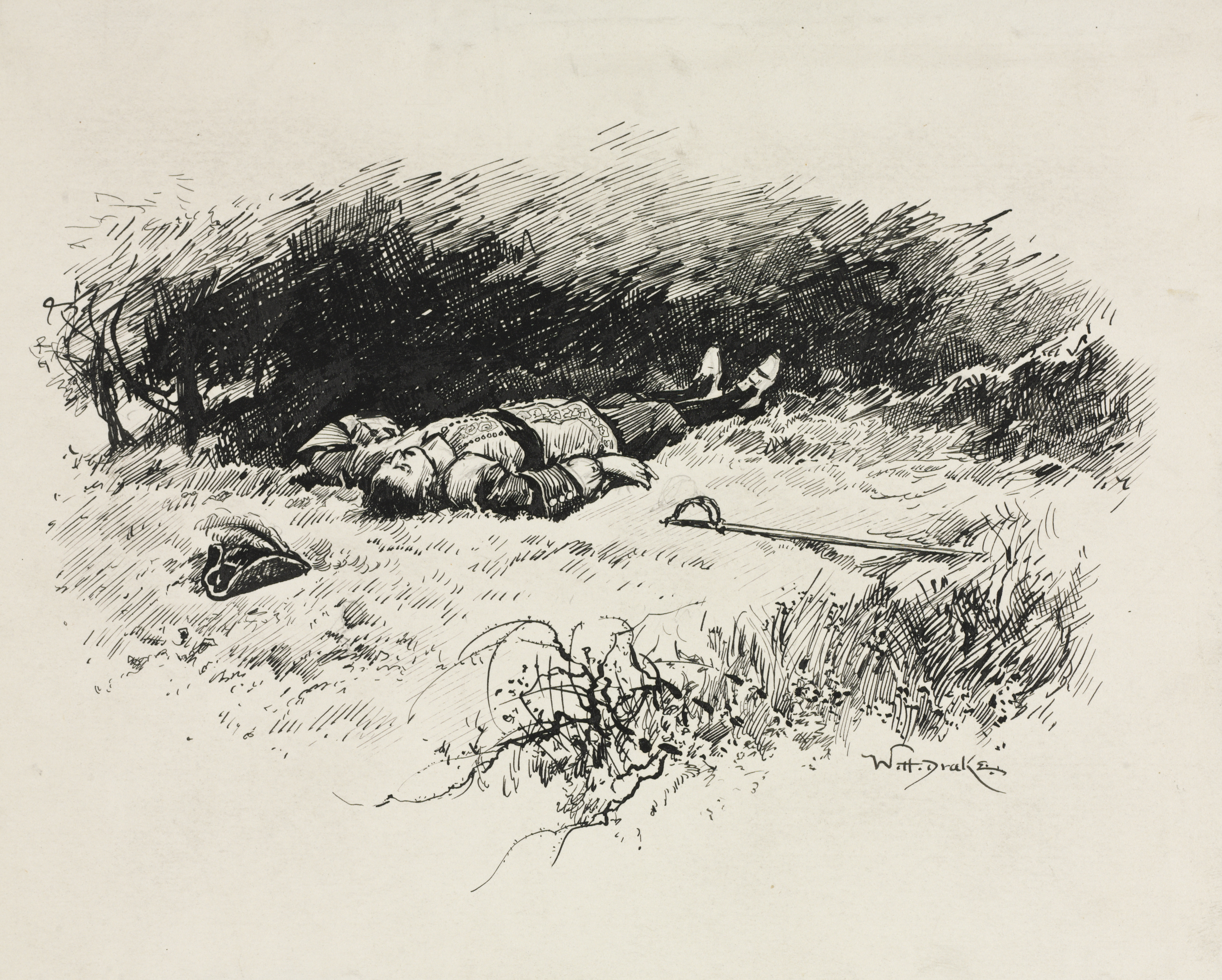 Black and white illustration of a man lying on the ground. The man is wearing a hat which is beside him. He wears a jacket with lace on it and sleeves rolled to the elbow. He has a thick beard and mustache. The man lies on grass. There are bushes and trees behind him. The sky is not visible. The drawing is signed in the lower right.