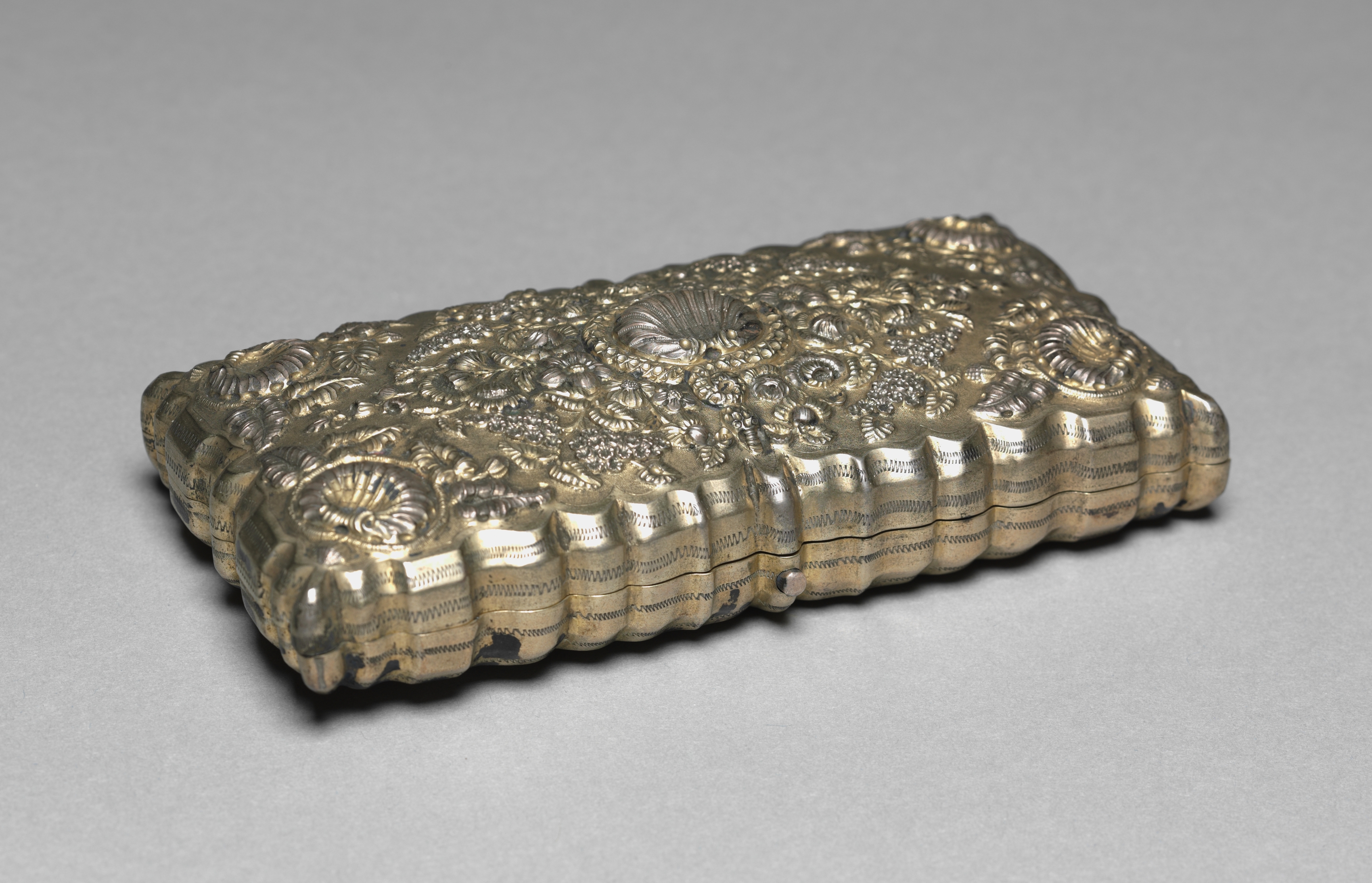 The Cigar Case by an unknown artist is a long, rectangular silver case. The case has a scalloped edge along its length. Its top surface features intricate engravings including floral patterns and other designs. The case appears to have a hinge and a small pin or rivet on one side, suggesting it can open. The case sits on a gray background.