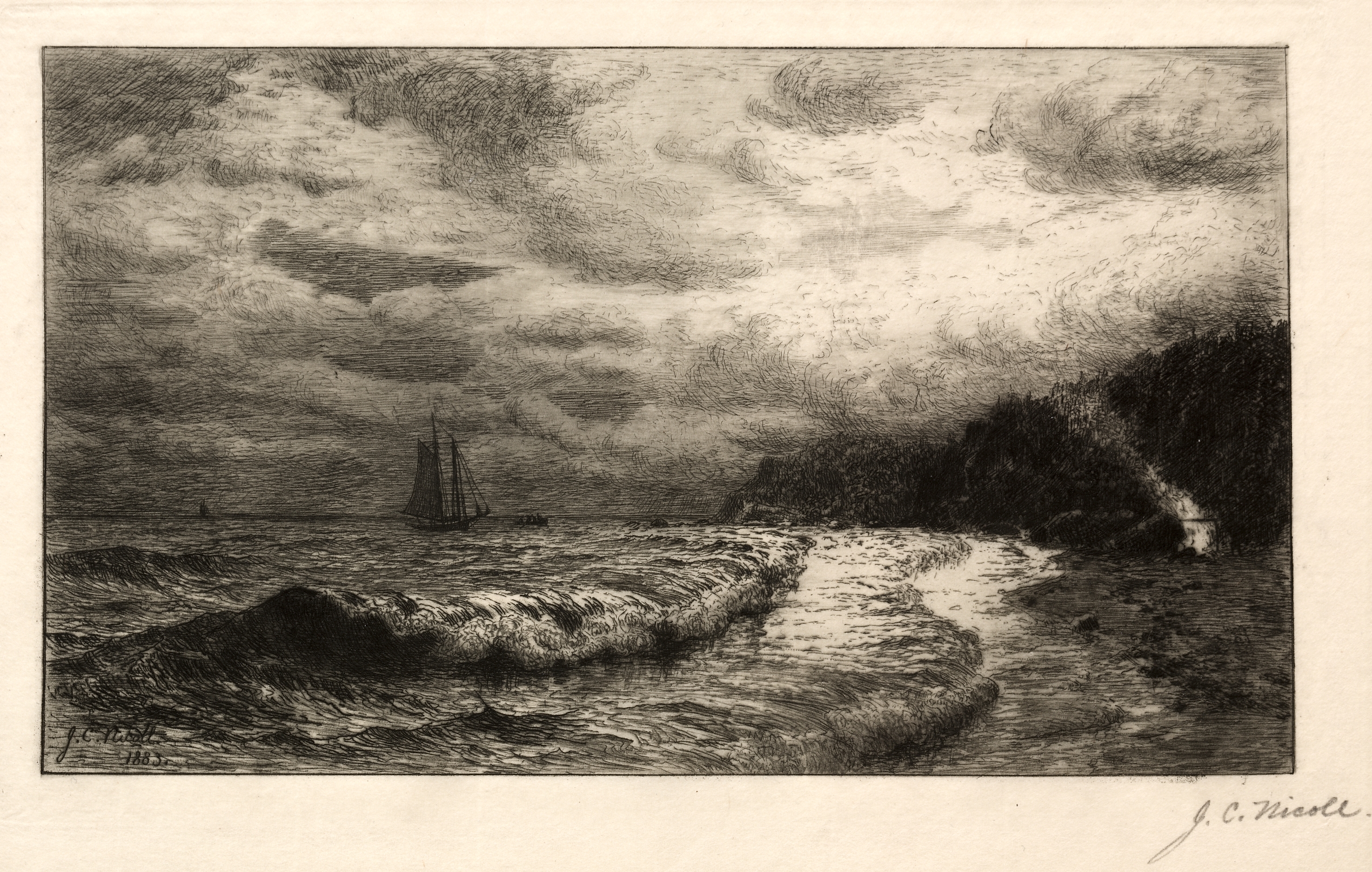 The Smuggler's Landing Place by James Craig Nicoll: A black and white drawing of a seascape. A large wave is crashing on the rocky shore on the lower center and right side. The wave is white and foamy. The water extends to the horizon. A two-masted sailboat is on the left side and a smaller boat is trailing behind. The sky is cloudy and dark. A cliffside juts out into the water on the right side. The image is drawn with much texture and shading. The artist's signature is in the bottom-right corner and a date is in the bottom-left corner.