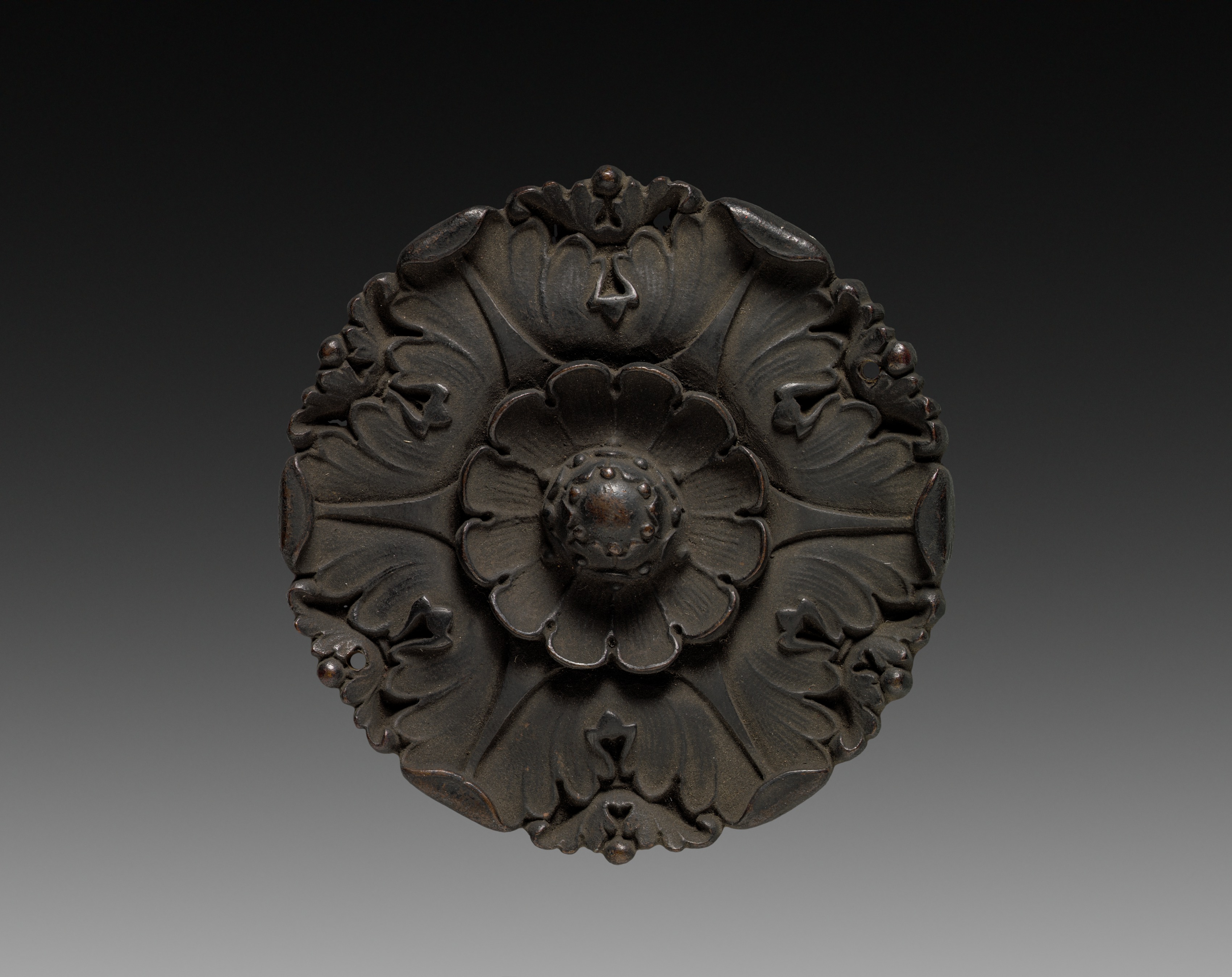 The image depicts a dark-colored, ornamental object. The object is round and flat with a raised design. The design features a flower-like pattern with a raised center and scalloped edges. The flower-like pattern is surrounded by curved lines that resemble leaves or petals. The object appears to be made of metal, possibly bronze or iron, and has a dark brown or black color. The background of the image is a gradient that transitions from black at the top to gray at the bottom. The title of the image is "Ornamental Detail".