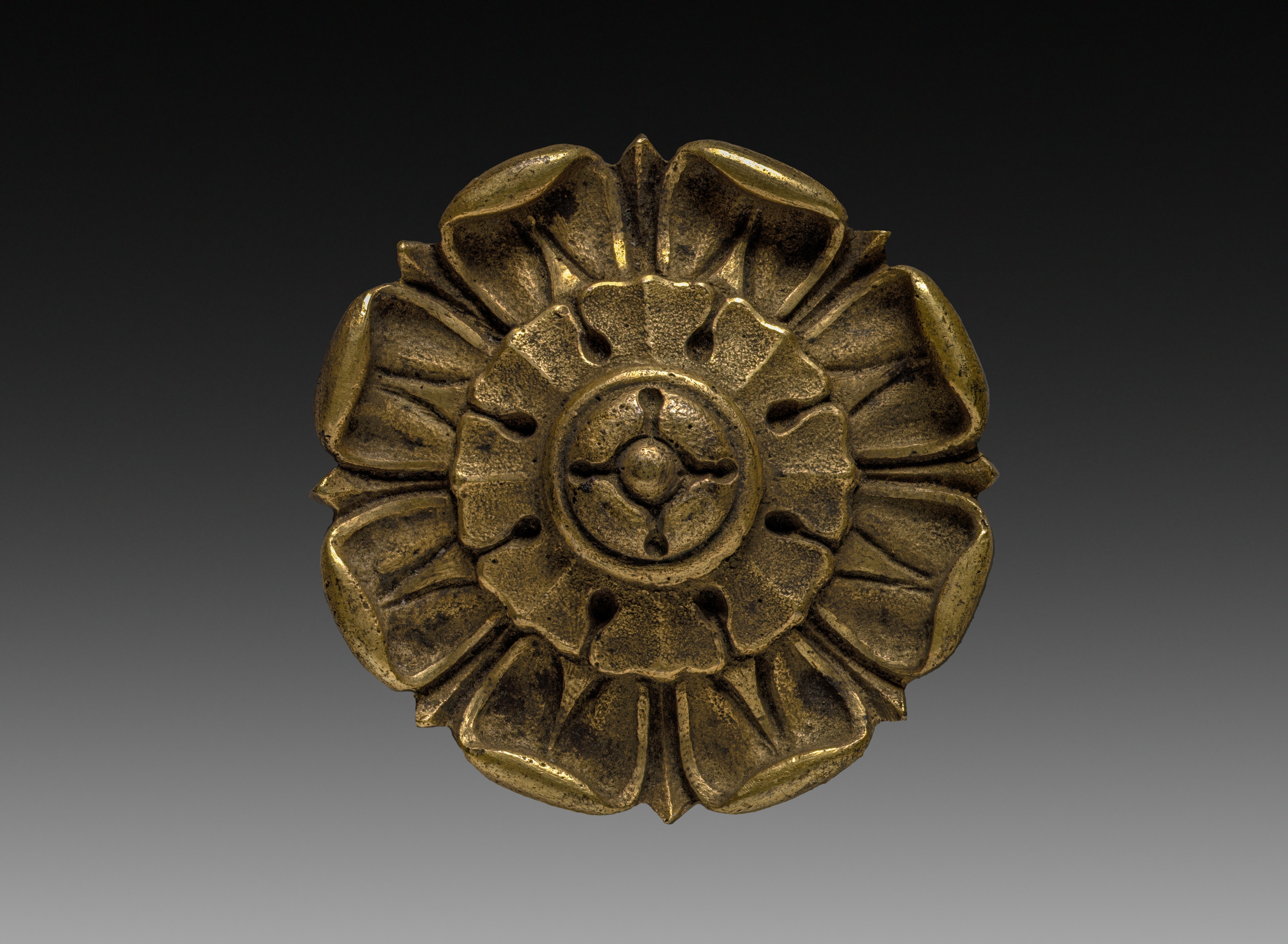 The image shows a bronze-colored metal object titled "Ornamental Rosette" by an unknown artist. The object is circular with a raised outer edge featuring 14 petal-like protrusions. The center of the object has a circular design with a cross-like shape in the middle, surrounded by eight oval-shaped holes. The background of the image is a gradient that transitions from black at the top to gray at the bottom. The object appears to be made of a bronze or brass material with a textured surface. The object is symmetrical and has a three-dimensional appearance.
