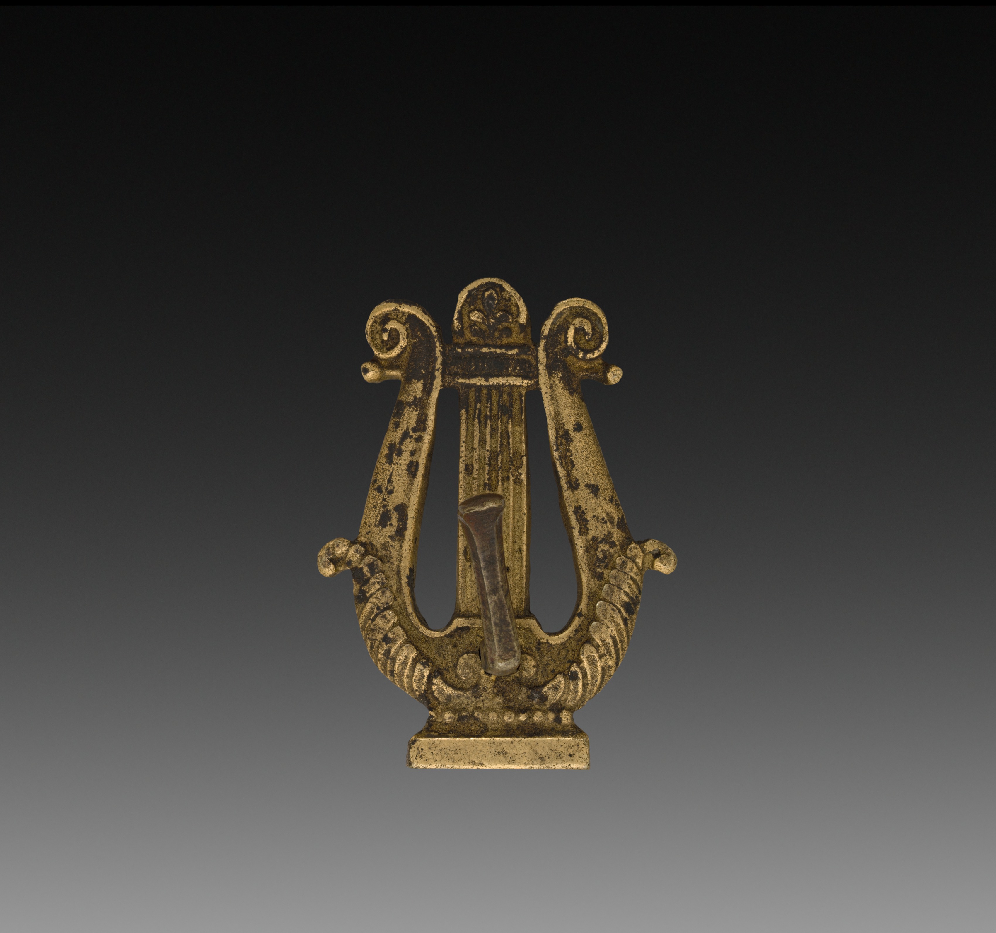 The image depicts a gold-colored lyre. The lyre has a rectangular base. The body of the lyre is U-shaped with a vertical line pattern down the center. A protrusion extends from the bottom of the U. The top of the U has a rounded rectangular shape with a design on it. Two scroll-like designs protrude from the top on either side. The lyre has decorative scrollwork along the bottom of the U. The entire piece appears to be made of metal and has a weathered look with many black spots. The background is dark at the top and lightens to gray at the bottom.