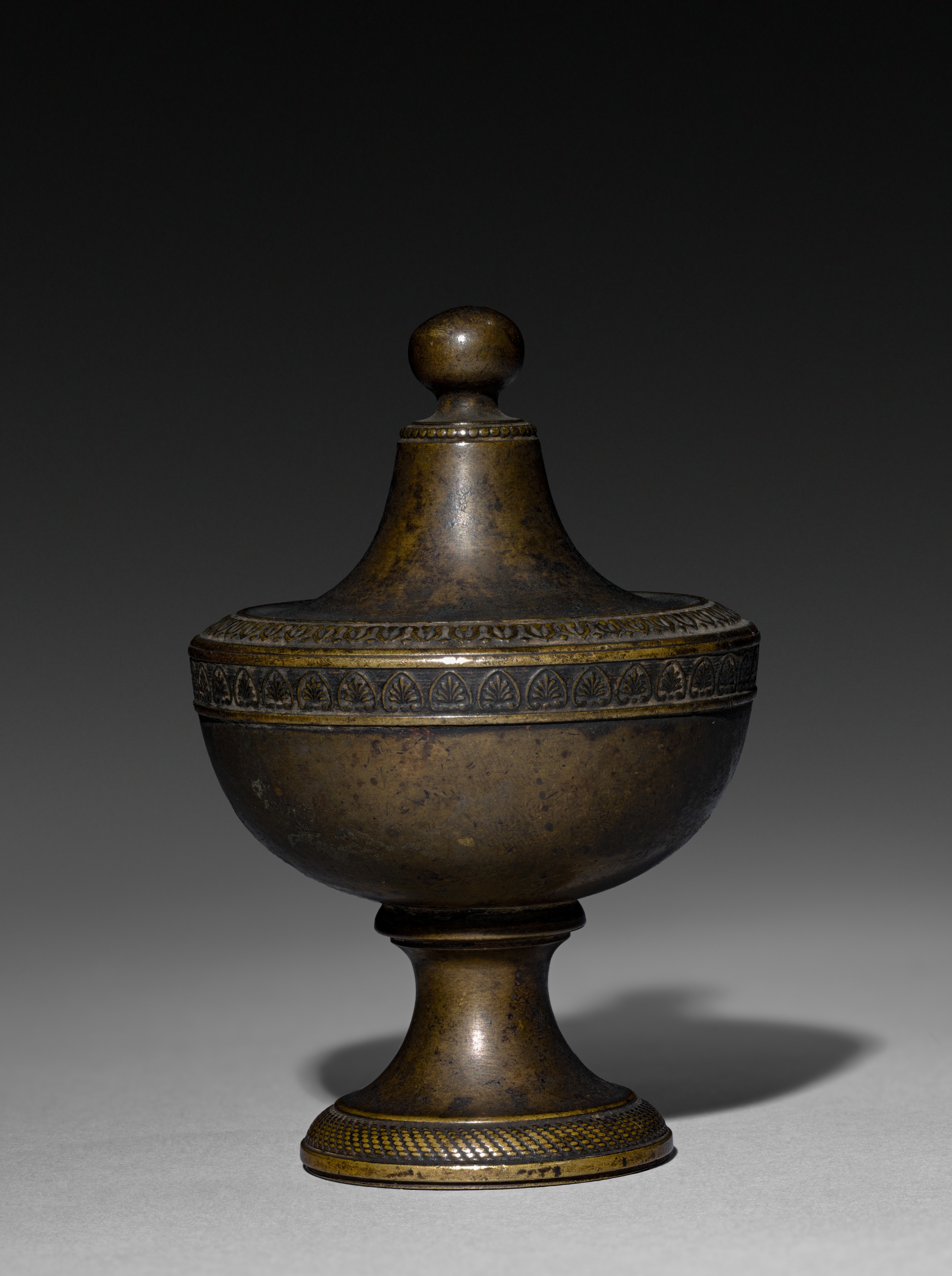The object is a bronze-colored finial. The finial has a rounded knob on top. The knob is on a short, thin neck with a decorative band below. The band has small circular indentations. The bowl of the finial is rounded and wide. The bowl has a decorative band around the middle with small teardrop shapes inside half circles. The base of the finial is narrow and flares out slightly at the bottom with a decorative band around it. The band at the base has small dots arranged in rows. The background is dark gray and light grey gradient. The object casts a shadow to the right. The object appears to be titled "Ornamental Finial" by an unnamed artist.