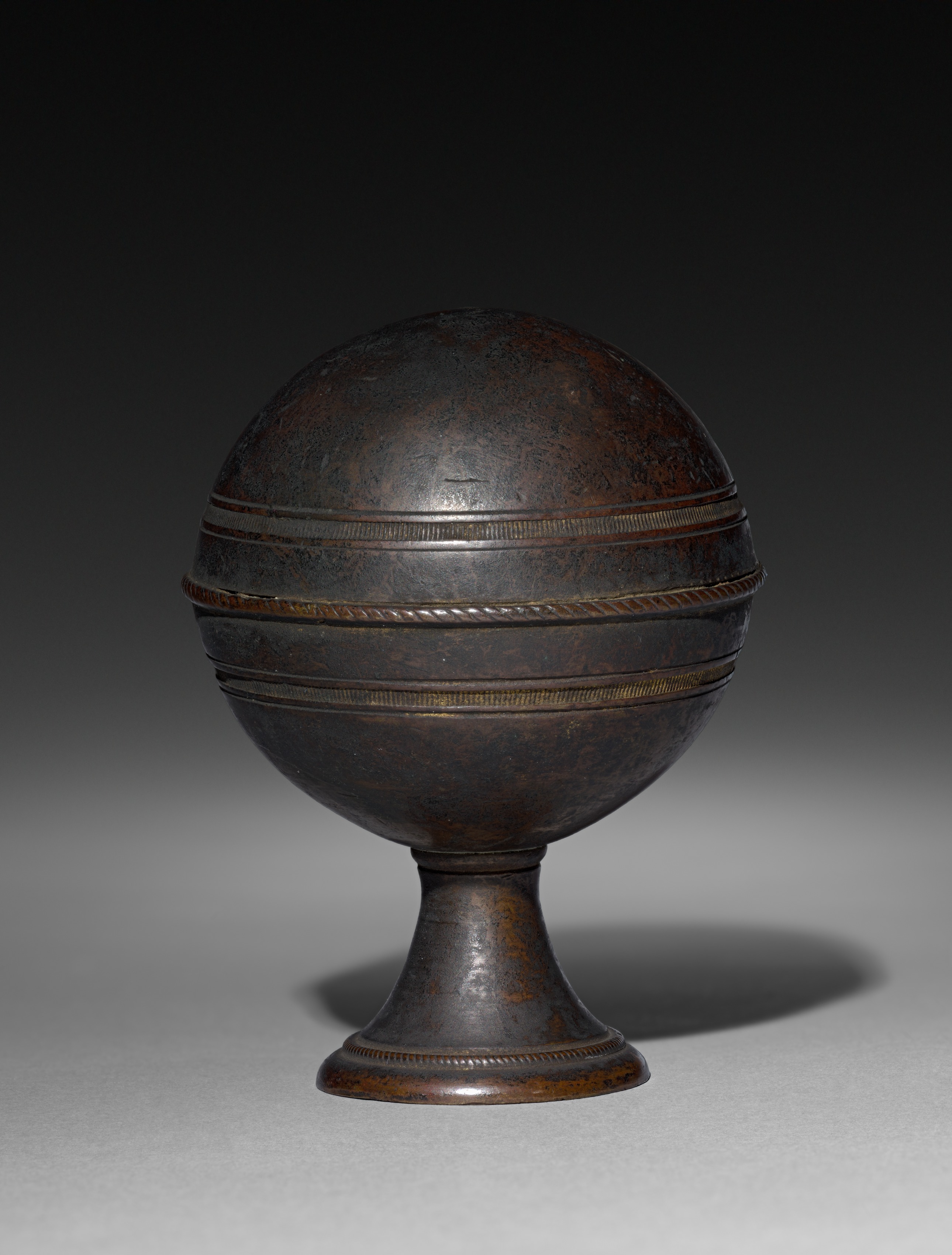 The Ornamental Finial by Unknown Artist features a dark brown, spherical object with a short, flared base. The sphere has a rusted appearance with visible signs of aging and wear. Three horizontal bands encircle the sphere, each with a distinct texture: one smooth, one with a rope-like pattern, and one with small, raised dots. The base of the sphere and the top of the stem have decorative edges with small, raised dots. The background is a gradient of dark gray to light gray, with the object casting a shadow to the right.