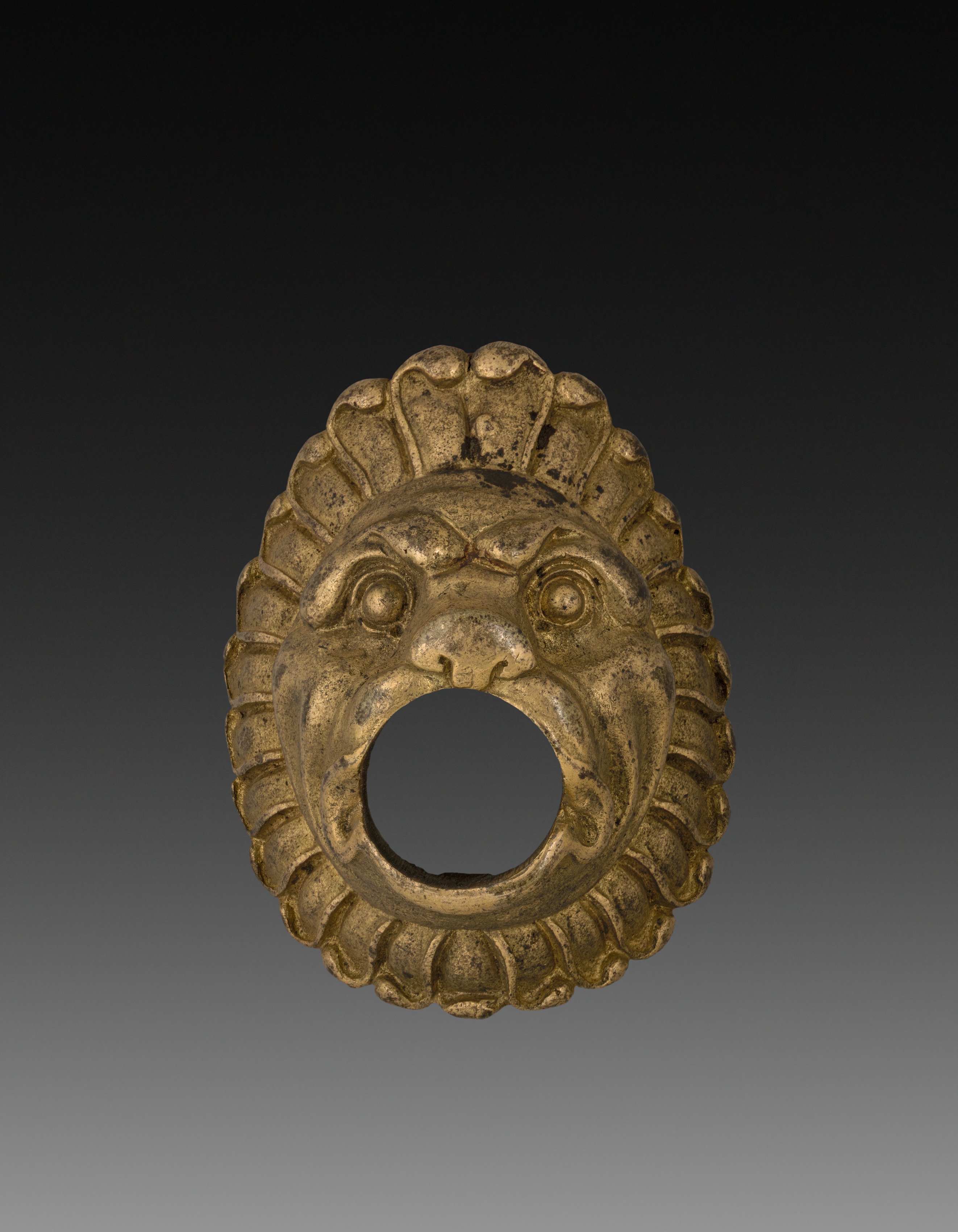 The object is a circular, gold-colored metal piece with a large central hole. The object has a face carved into it with a nose, mouth, and two eyes. The face is surrounded by a ruffled edge resembling hair or a mane. The object is made of a weathered gold-colored metal with visible signs of aging and wear. The background of the image fades from black at the top to gray at the bottom. The artist and title of the object are "Ornamental Detail".