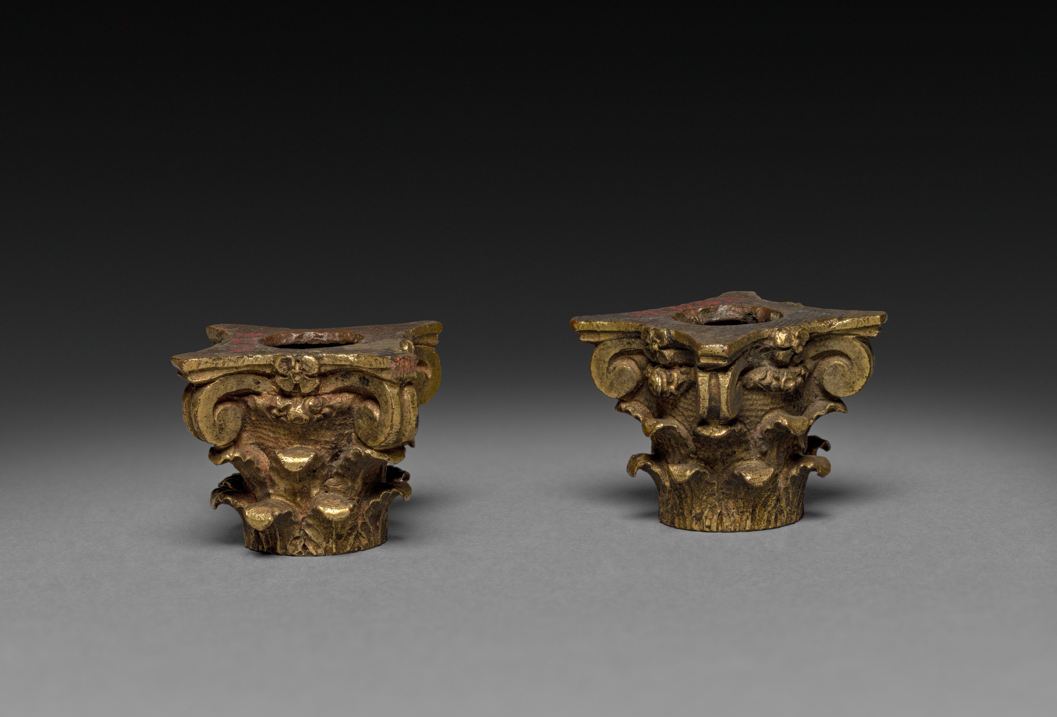 The image shows two small, ornate, gold-colored objects. The objects are square on top and have a rounded, decorative base. They appear to be made of metal, possibly bronze or brass, and have a distressed or aged appearance. The top surface of each object is flat and square with rounded corners. There are decorative elements on the sides, including curved scroll-like designs and what appears to be acanthus leaves. The base of each object is rounded and has a decorative edge. The background of the image is dark at the top and lightens towards the bottom, with a gradient from black to gray. The objects are centered in the image and are casting a slight shadow on the surface below them. The title of the image is "Ornamental Capital".