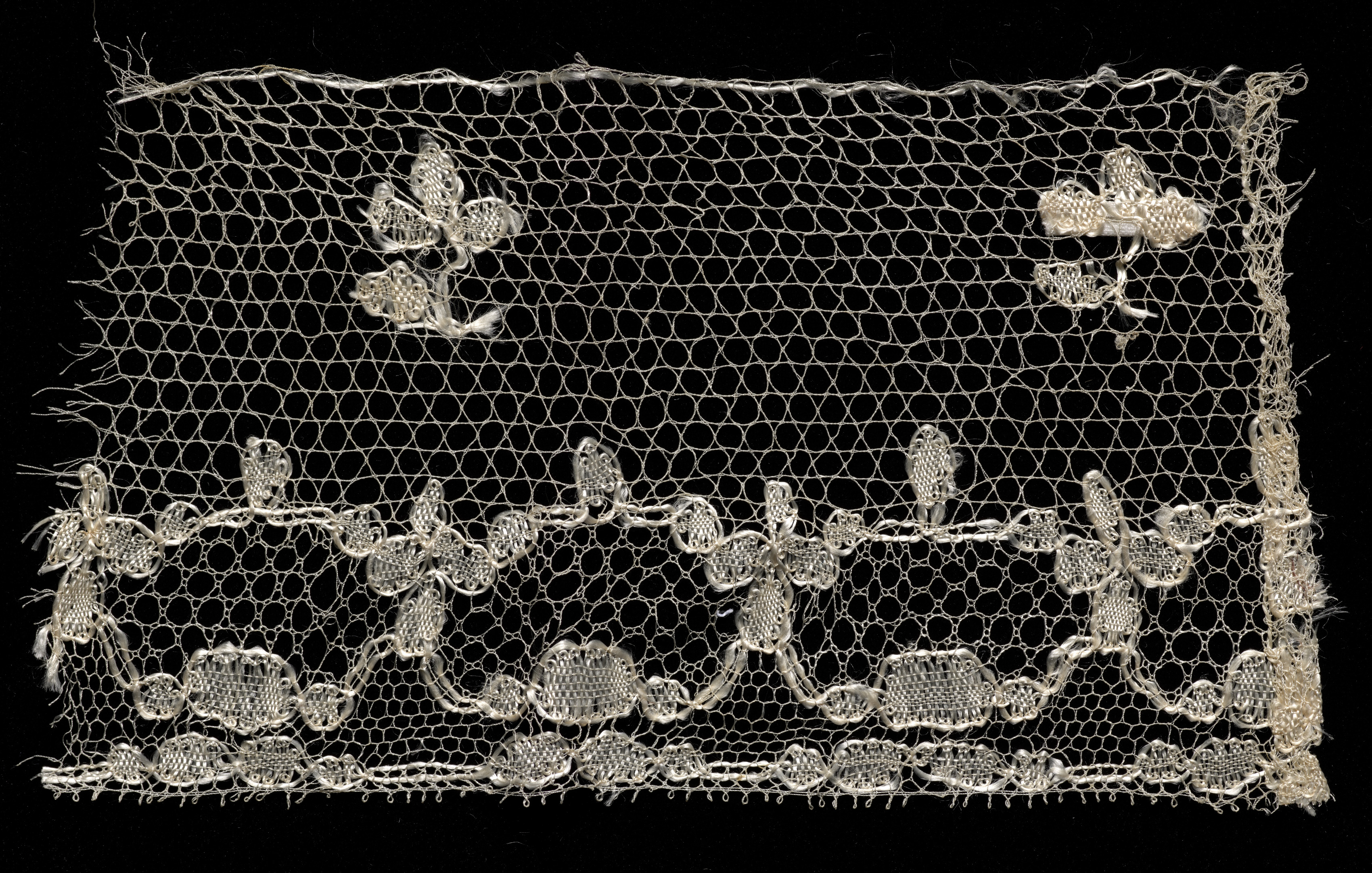 The image depicts a piece of bobbin lace edging by an unknown artist. The lace is rectangular, wider than it is tall. The lace is made of white or off-white thread. The background of the lace is a net-like pattern of hexagonal cells. The lace features a repeating design of flowers and leaves along the bottom edge. The flowers have five petals, and the leaves have a teardrop shape. The lace has a scalloped edge along the bottom. The top edge of the lace is rough and uneven. The lace is set against a solid black background.