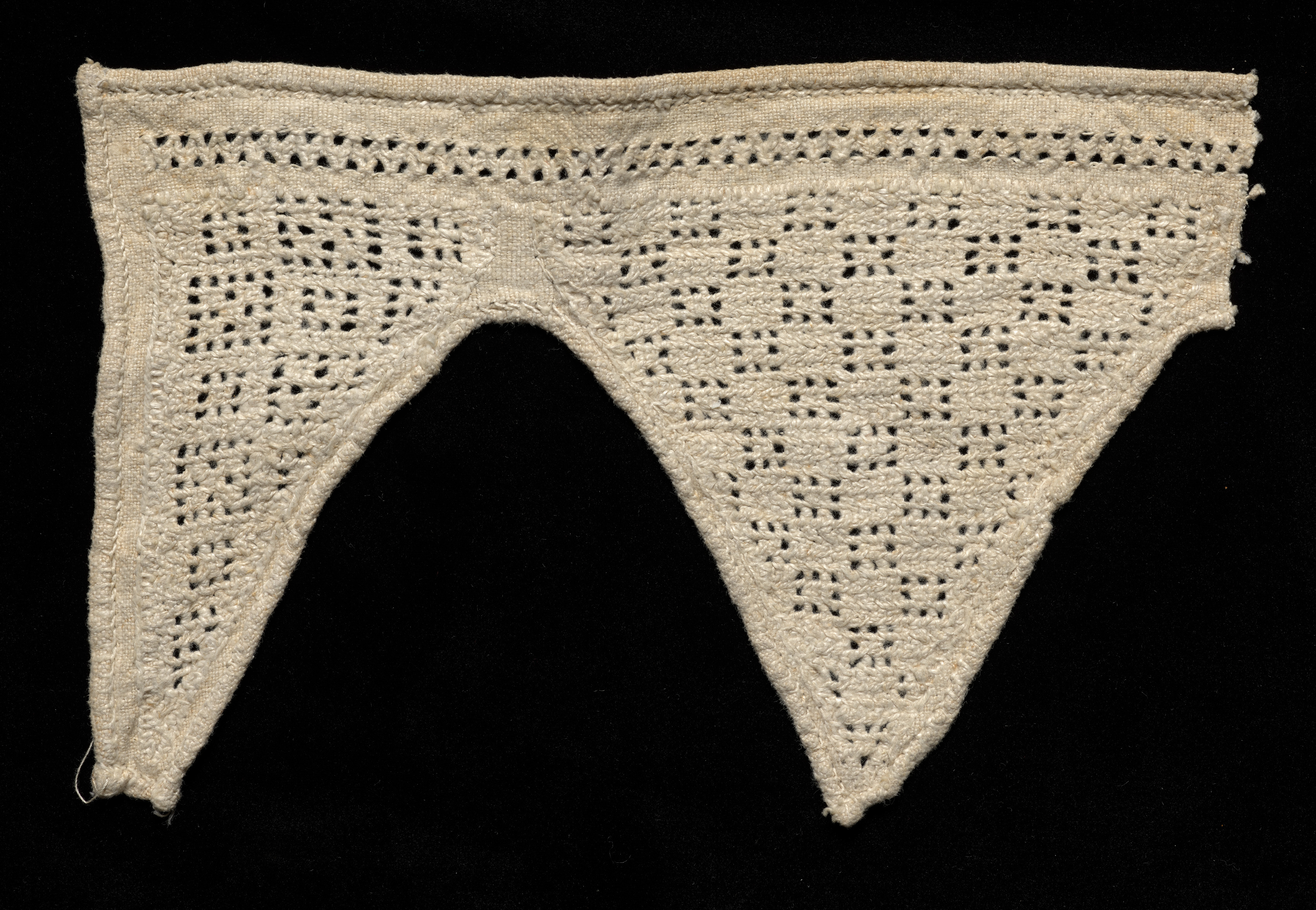 The image shows a portion of a cream-colored lace collar, triangular in shape, resembling a semi-circle with a curved bottom, and features intricate drawnwork and needlepoint designs. The lace material is off-white with a fabric-like texture, exhibiting a woven appearance with visible holes arranged in geometric patterns. The top edge of the lace appears to have a double row of stitching or weaving for reinforcement or decoration; the sides and bottom are less dense with patterns. The background of the image is black, providing high contrast to highlight the details of the lace collar. The entire piece features symmetrical patterns on both sides of a central curved cutout. The lace seems to have been carefully crafted with precision and attention to detail.