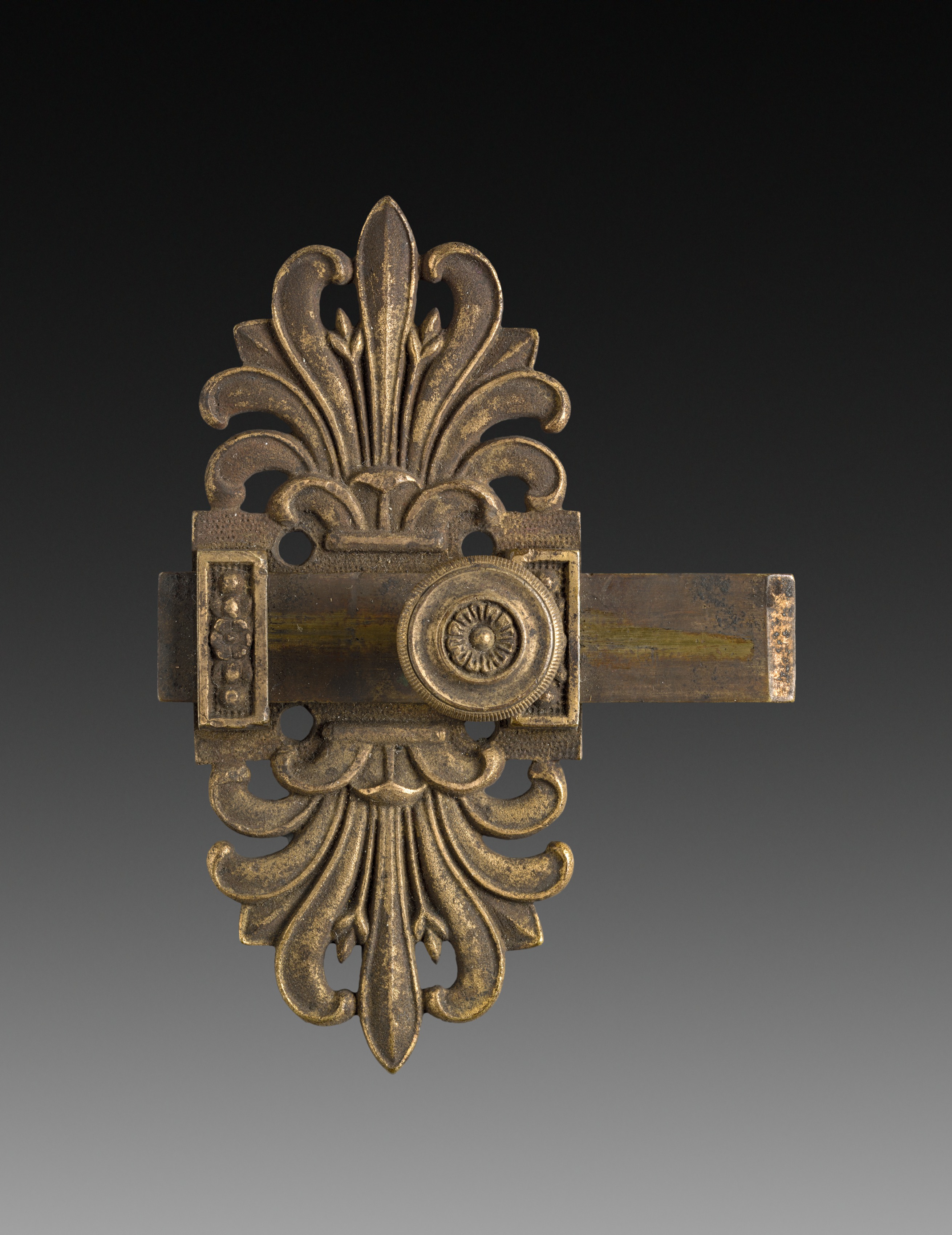 Ornamental bolt by Goro Ando: Bronze door latch with ornate leaf design and sunburst wheel. Rectangular piece with protruding latch on right. Decorative plate features raised floral pattern with central leaf and curved lines.