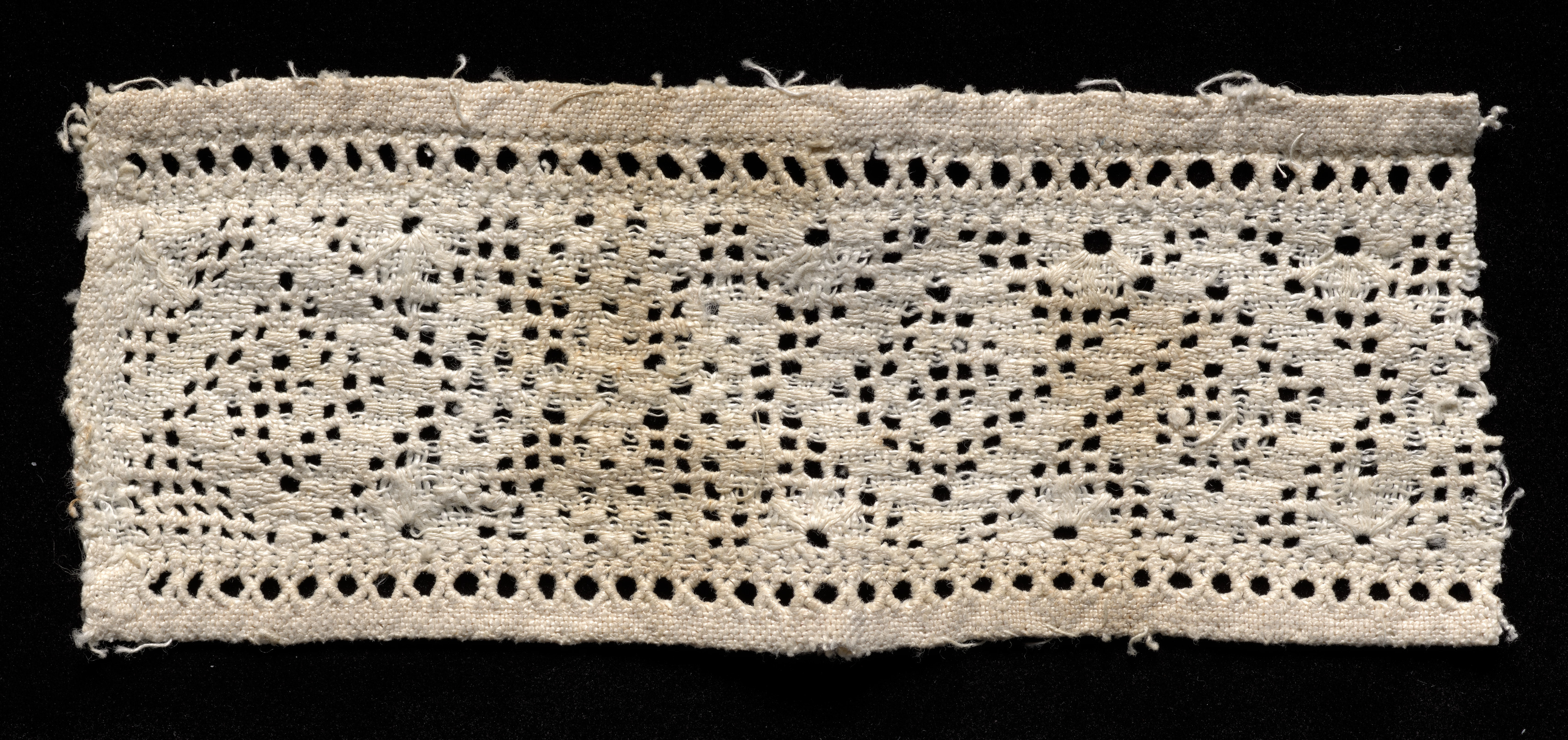 The image shows a rectangular piece of off-white fabric with a decorative edge and a pattern of holes. The fabric has a thick border at the top with a row of small holes underneath, then a row of oval-shaped holes, then a section with many small holes arranged in horizontal rows, then a row of oval-shaped holes, and a frayed edge at the bottom. The background is black. The fabric appears to be a type of lace, specifically a Needlepoint Lace Band by an unknown artist.