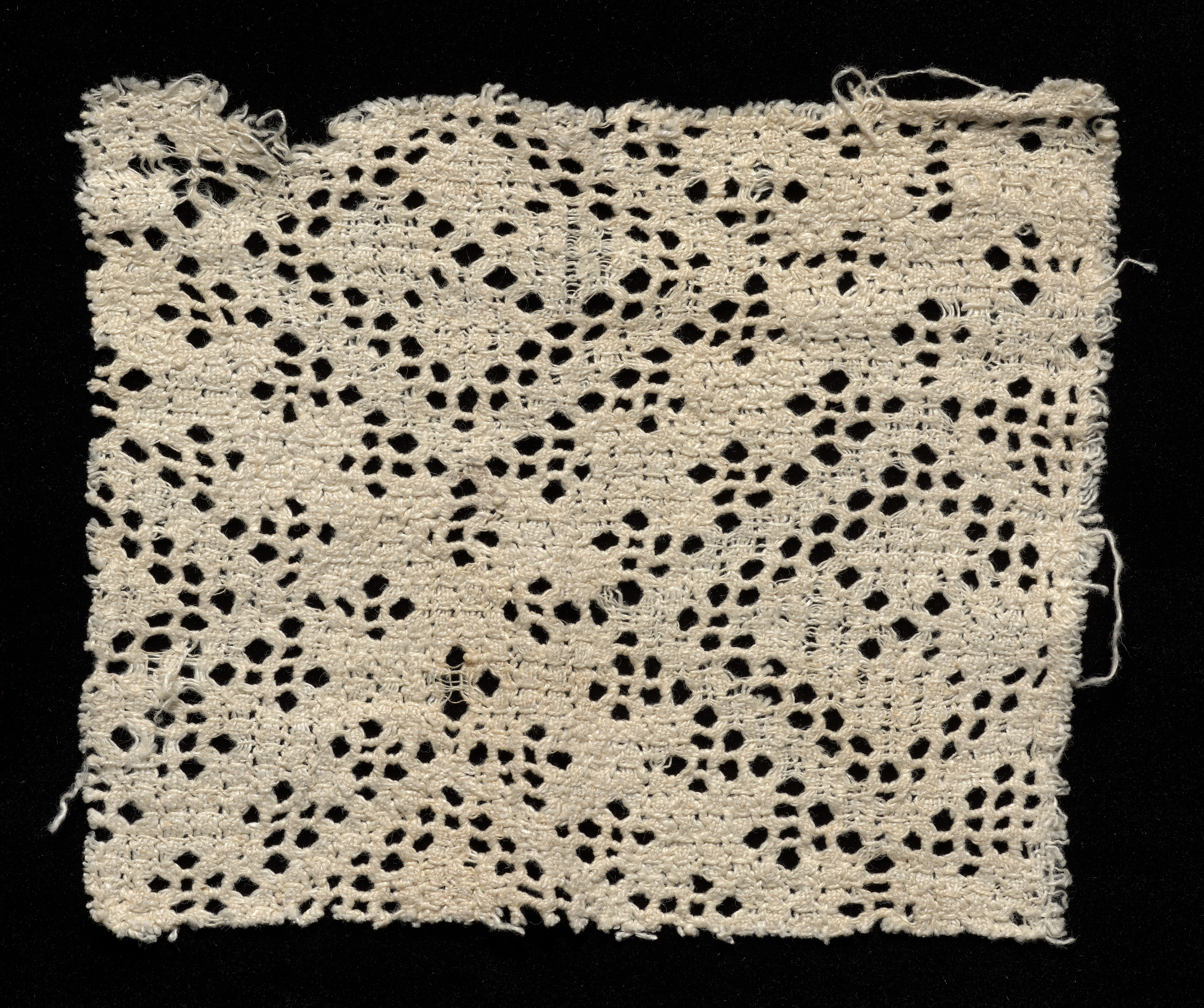 The image depicts a square piece of Needlepoint (Drawnwork) Lace Fragment by an unknown artist. The square piece of fabric is made of off-white thread and features a complex pattern of holes and stitches. The fabric has a rough, frayed edge around its perimeter, with some threads hanging loose. The background of the image is solid black, providing high contrast to the fabric. The fabric's pattern consists of rows of small holes and interconnected loops of thread. The loops and holes are arranged in a repeating design that covers the entire surface of the fabric. The fabric appears to be fragile and delicate, with some areas showing signs of wear or damage. The image presents a close-up view of the fabric, with no other objects or features visible. The overall appearance of the fabric suggests it may be a historical or antique piece, possibly used for decorative purposes.