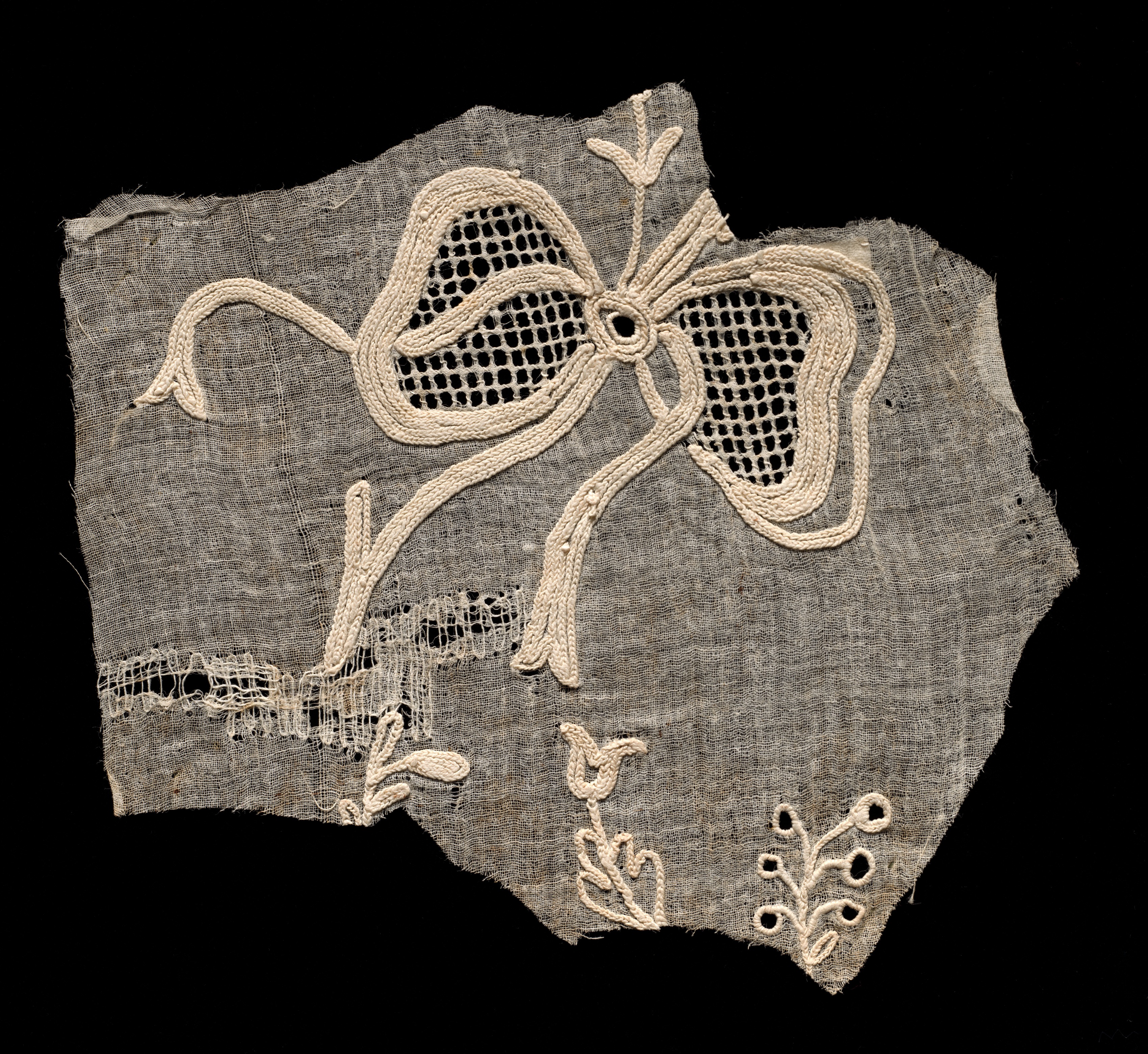 Embroidered Fragment by an unknown artist is a piece of fabric with an embroidered design. The fabric is grayish-brown, with rough and uneven edges. The embroidery is cream-colored thread on a mesh-like fabric. The design features a bow-like shape with long tails and a circular center. The bow-like shape has a mesh-like interior. There are two long, curved lines extending from the bow, resembling stems or leaves. A smaller floral or leaf-like design is at the bottom right. The background of the image is solid black.