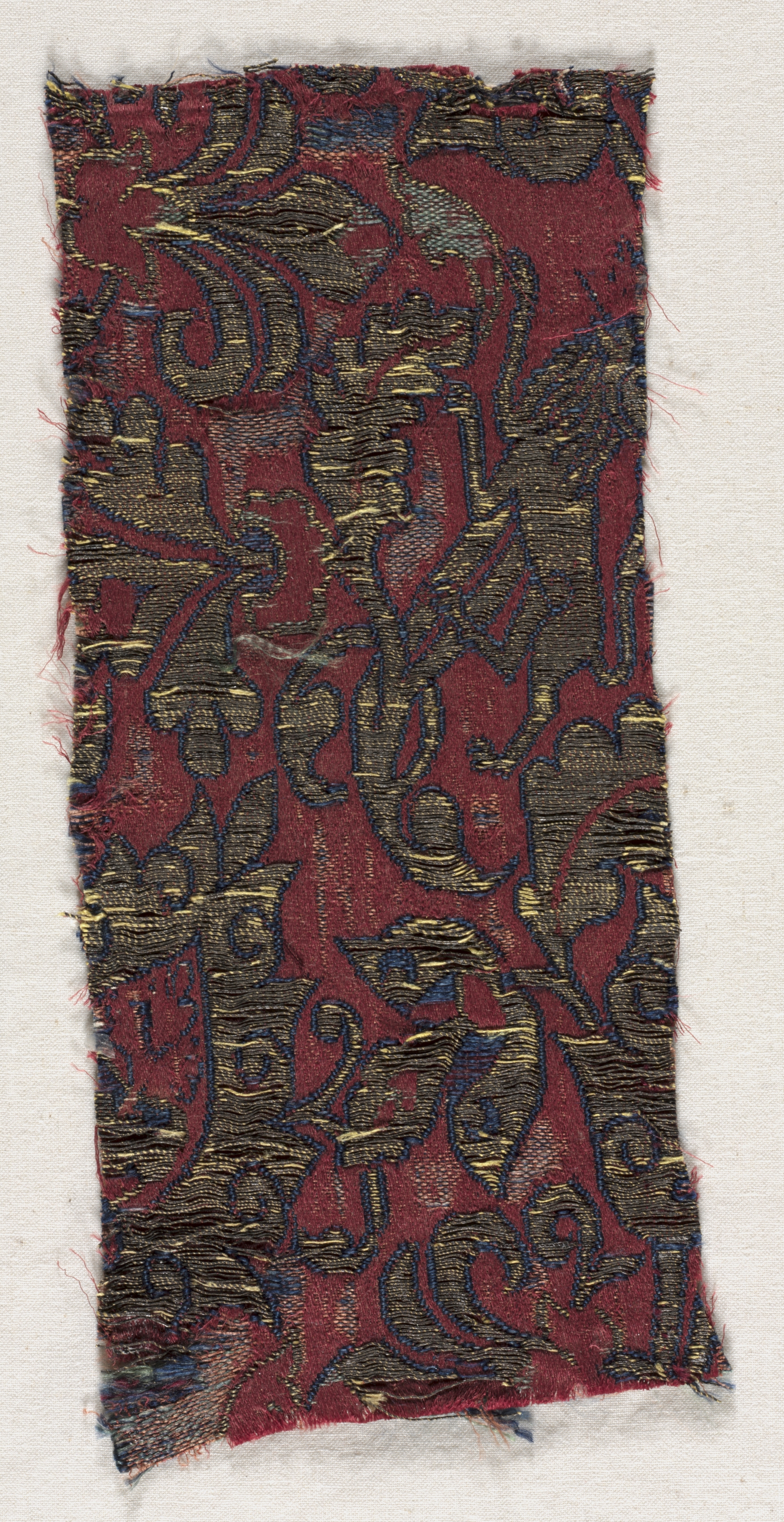 Red fabric with a gold and blue floral pattern; frayed edges; rectangular, slightly taller than wide. The textile fragment is by an unknown artist.
