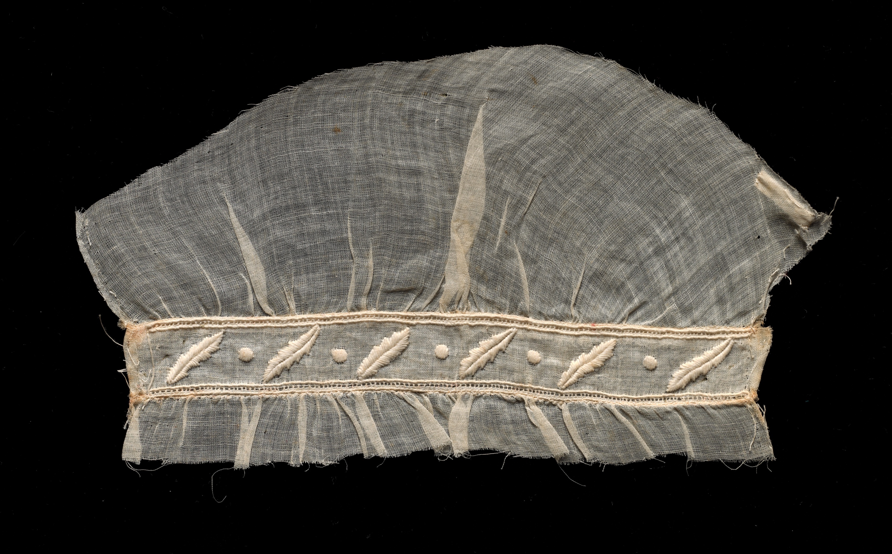 Embroidered Fragment by artist unknown. Gray fabric piece resembling a curved, semicircular shape with frayed edges. Fabric appears semi-transparent and has visible texture. A decorative band across the bottom third features raised white embroidery in a leaf-like pattern, with small round beads or stitches between the leaves. The band has two horizontal rows of stitching on top and bottom. The background is solid black.