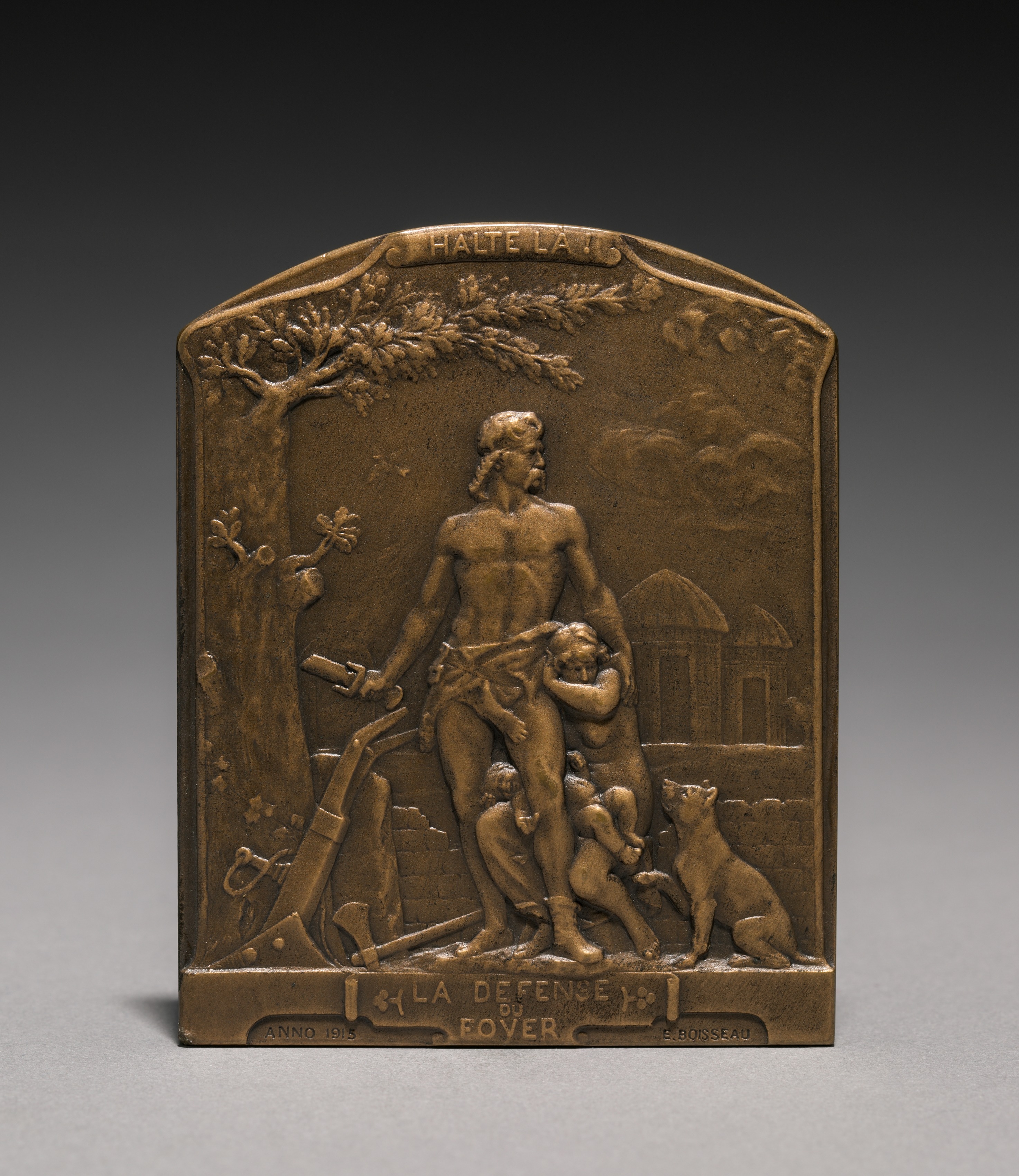 Bronze medal with a man standing and holding two children, a dog sitting to his right. The man and children are standing in front of a tree on the left and a building in the background on the right. The man holds a rifle in his right hand. A dog sits on the right. Text on top reads "HALTELAJ" and at the bottom "ANNO 1915 LA DEFENSE DU FOYER." The medal is bronze colored.