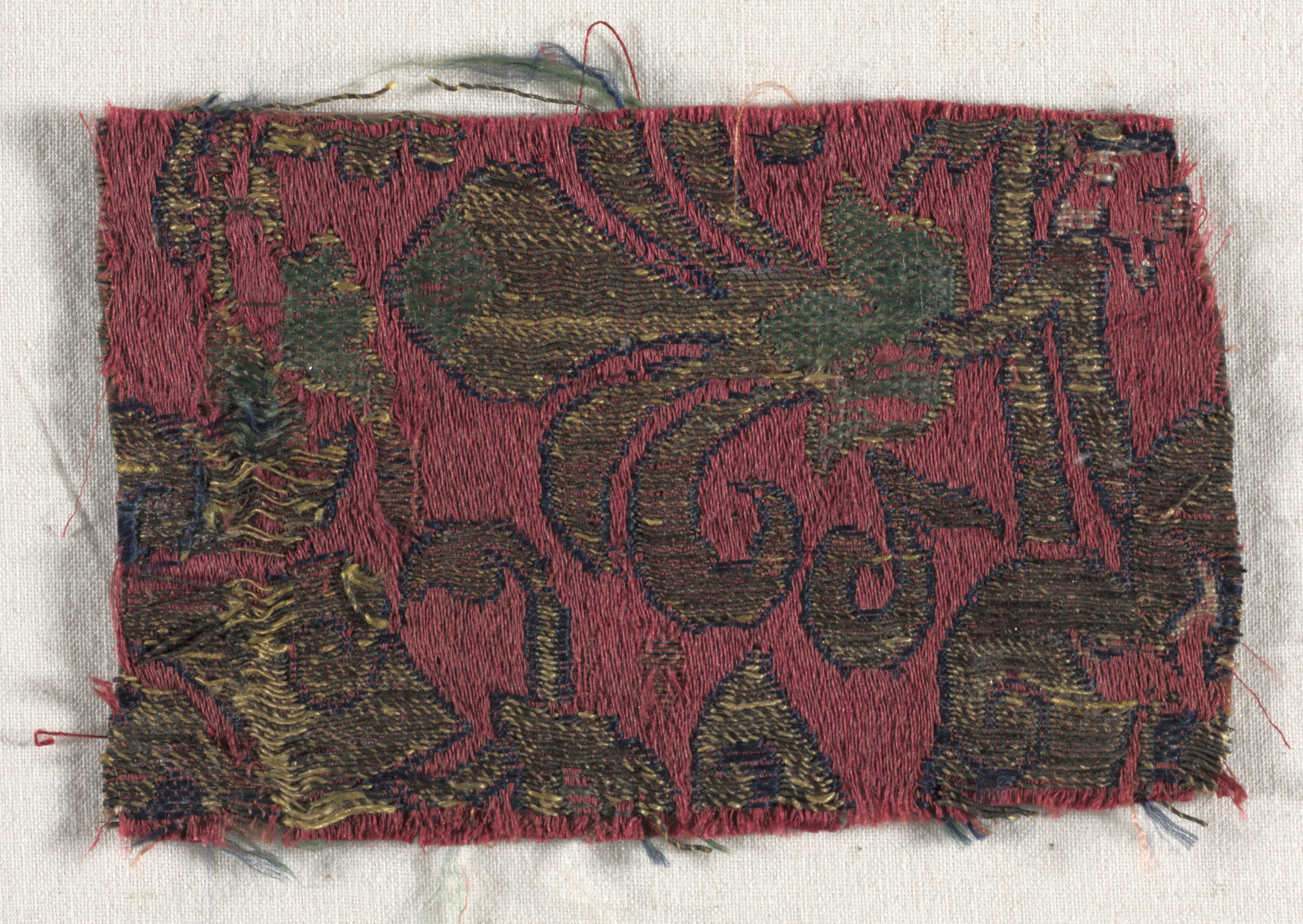 Red and brown textile fragment with green details, rectangular shape, frayed edges, visible threads, intricate patterns, mounted on off-white fabric background. Textile Fragment by unknown artist.