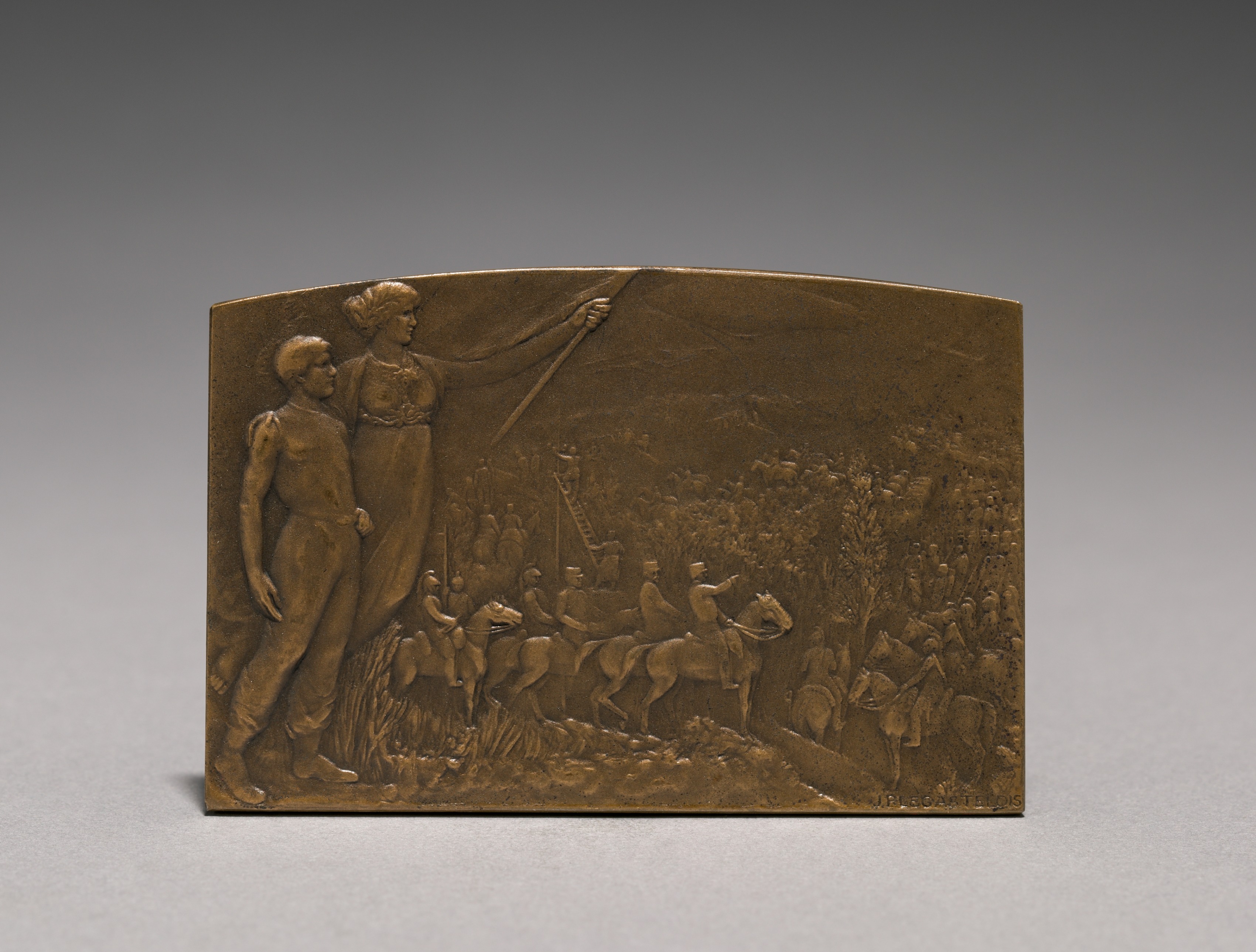 Bronze plaque. The plaque depicts a raised scene with two people on the left and a mounted procession on the right. On the left are two people: A man on the left looking right; A woman on the right pointing to the right with her right hand and holding a flag or banner with her left hand. The man wears a short sleeve shirt and pants; The woman wears a skirt and shirt. On the right are people on horseback and on foot. The plaque has an arch at the top. The plaque sits on a gray gradient background.