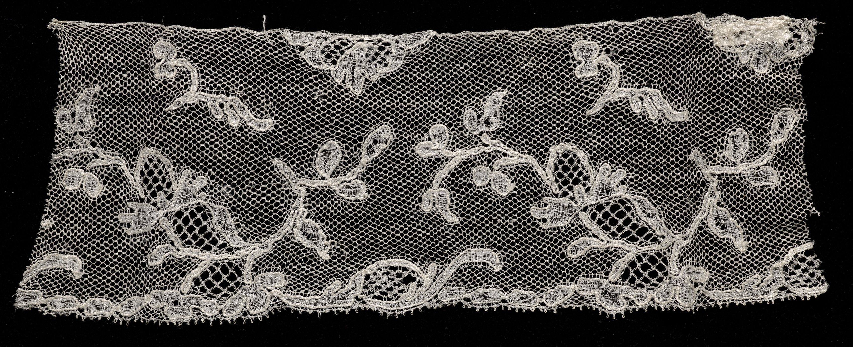 White bobbin lace fragment with a floral design on a black background. The lace features a repeating pattern of floral motifs and scrollwork. The top and bottom edges are frayed, with the bottom edge having a more defined scalloped pattern. The lace is made of a mesh-like material with hexagonal holes, and the floral design is created using a combination of curved lines and shapes. The overall shape of the fragment is rectangular with rough edges. The artist and title of the piece is "Bobbin Lace Fragment".