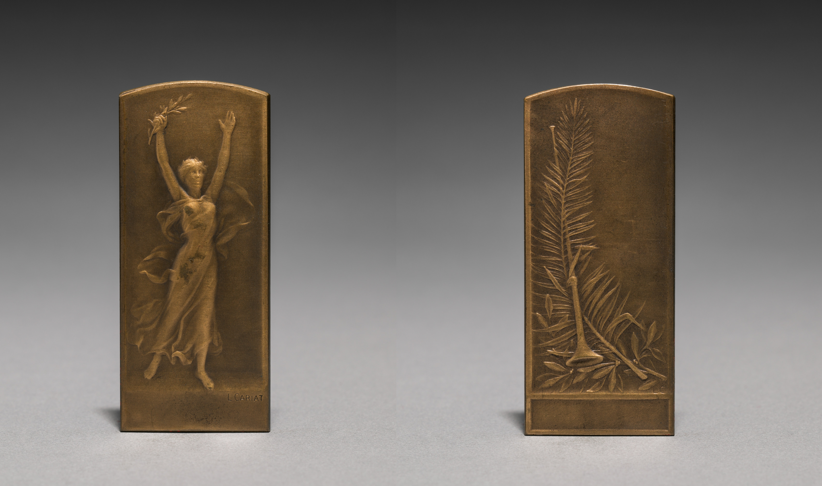 Medal by Lucien Julien Henri Cariat. Two bronze-colored, rectangular plaques with rounded tops. The left plaque features a raised relief of a woman in a flowing dress with her arms raised above her head, one hand holding a branch. The woman's hair is short and her dress flows behind her, with a signature at the bottom right. The right plaque features a raised relief of a plant with long, thin leaves. The background of the image fades from dark gray at the top to light gray at the bottom. The plaques cast slight shadows on the surface below them.