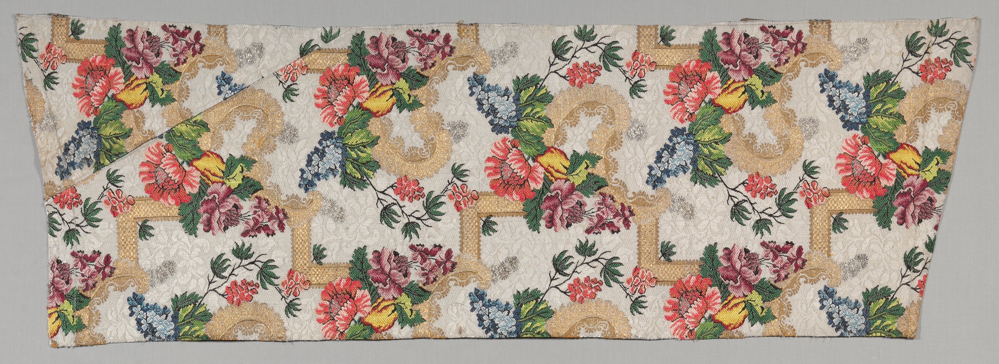 Rectangular piece of fabric with a white background and gold interlocking squares. The squares have a floral pattern featuring pink, red, yellow, blue and purple flowers with green leaves. The fabric appears to be brocaded, with raised patterns and shiny threads. The fabric is laid flat on a gray background. The title of the piece is "Brocaded Textile".