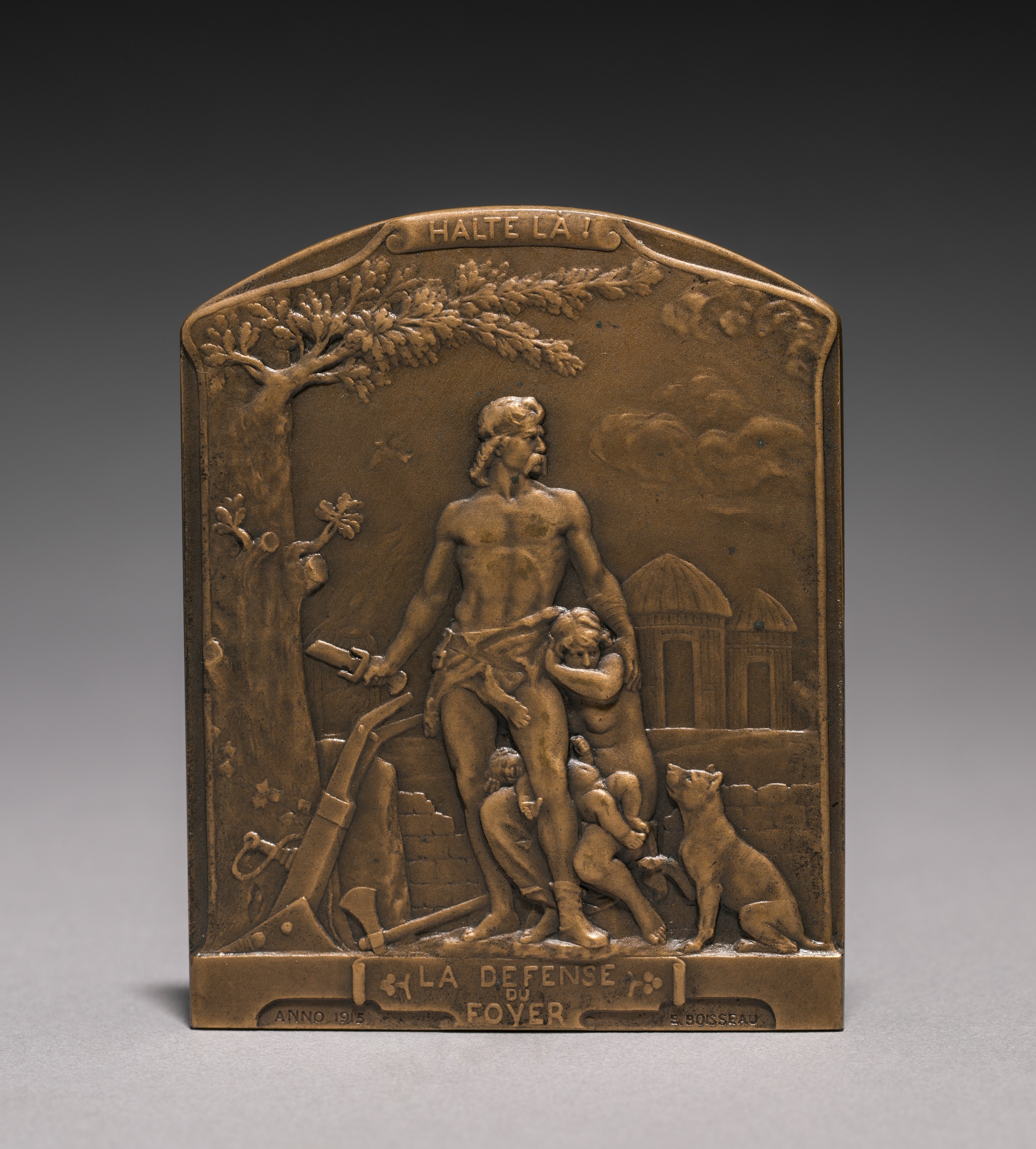 Bronze-colored medal with a rounded top. A man stands in the center, holding a rifle with a bayonet in his right hand and a child in his left. The man is shirtless and wearing a loincloth. A dog is positioned on the right side, and another dog and a child are on the left. A tree is on the left, and a building is in the background on the right. The words "HALTE LÀ" are at the top. The words "LA DEFENSE DU FOYER" are at the bottom. The medal has a bronze color with a weathered appearance. The background is grey with a dark vignette effect.