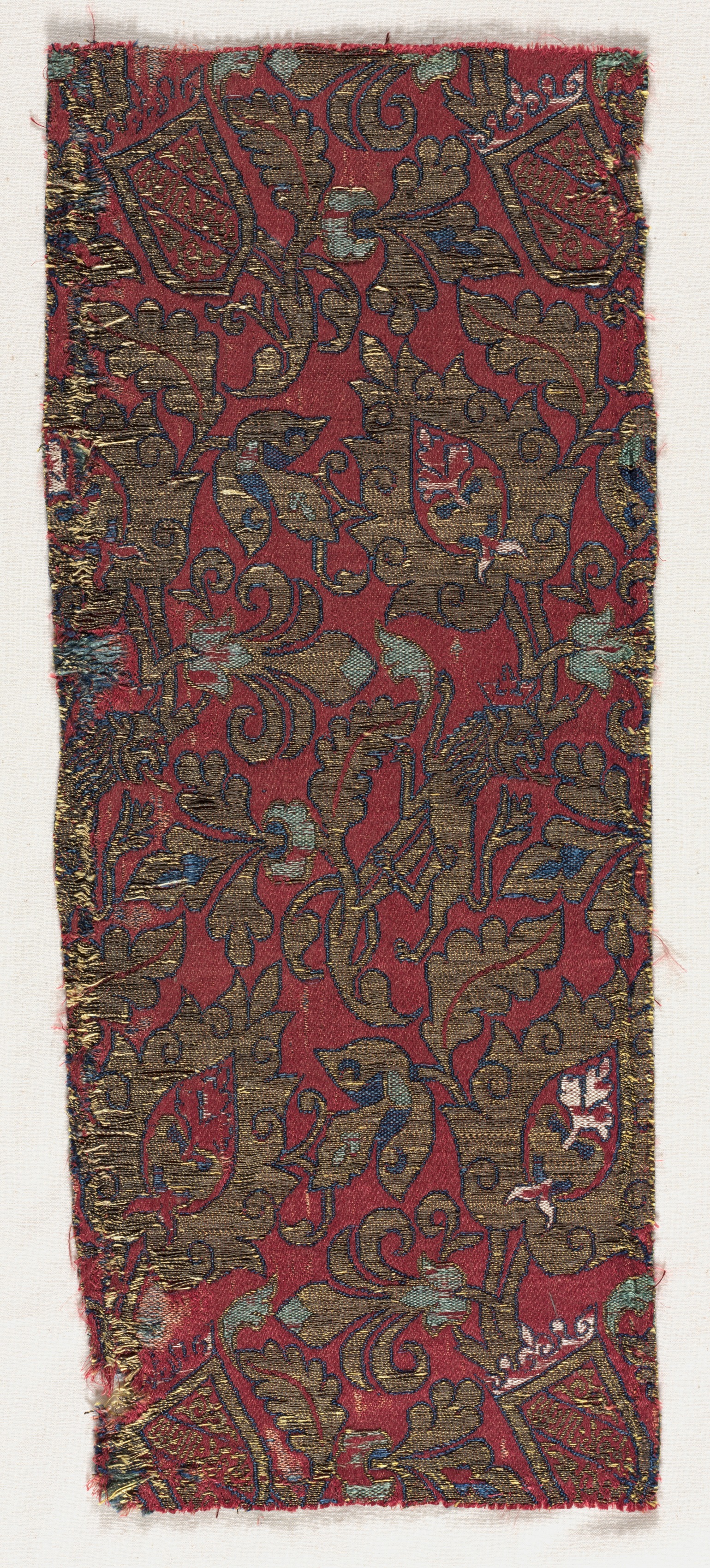 Red fabric with a repeating pattern of gold, blue and white designs. The designs feature undulating vines with leaves. Interspersed among the vines are lions. The lions are white with blue details and gold outlining. The fabric edges are frayed. The title of the piece is "Lampas with undulating vines and lions".