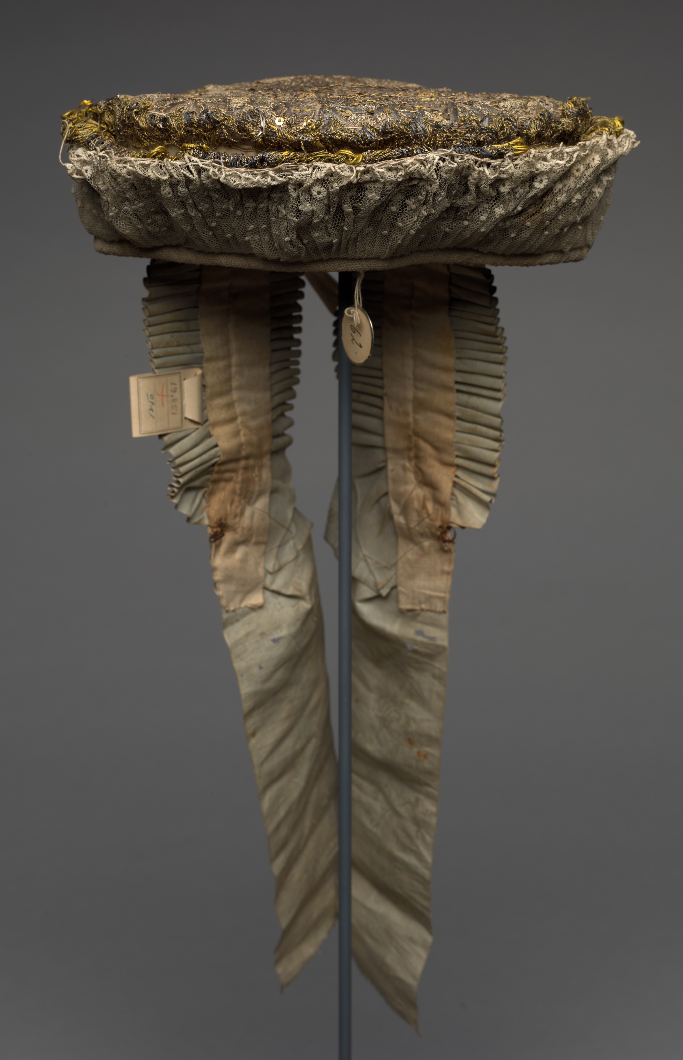 Embroidered Headdress (Called "Triesische") by an unknown artist. The headdress is mounted on a stand. The top of the headdress is a wide, flat, rounded rectangle. Top surface is covered with dark brown fabric with gold threads. The underside of the top is covered with light-colored lace fabric. Attached to the back are two long, curved beige ribbons. The ribbons are pleated and have several folds. The ribbons are stained and have some discoloration. A small, oval-shaped tag hangs from the center. The background of the image is dark gray.