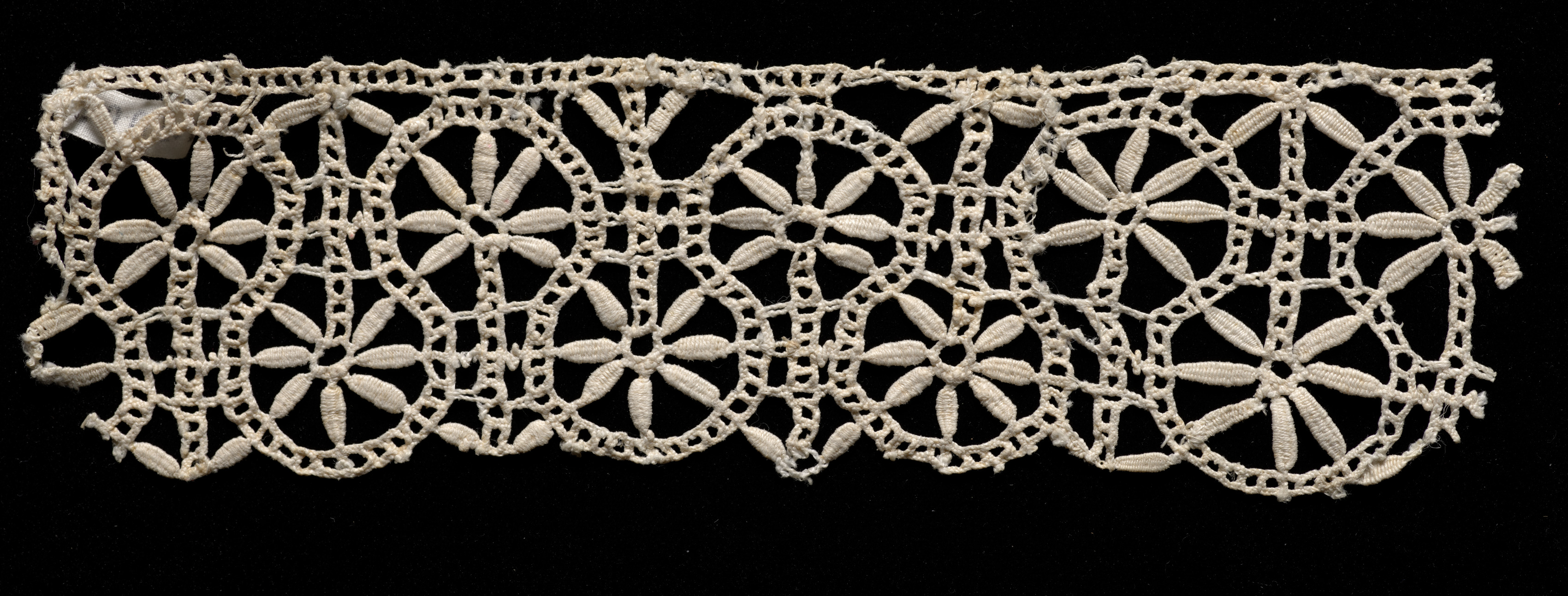 The image shows a piece of white bobbin lace edging, also known as rose lace. The lace is long and rectangular with a repeating pattern. The pattern consists of flower-like shapes with eight pointed petals connected by circles and ovals. The flowers are arranged in rows, with each row connected to the one below it by small oval shapes. The lace has a scalloped edge at the bottom. The background of the image is black.