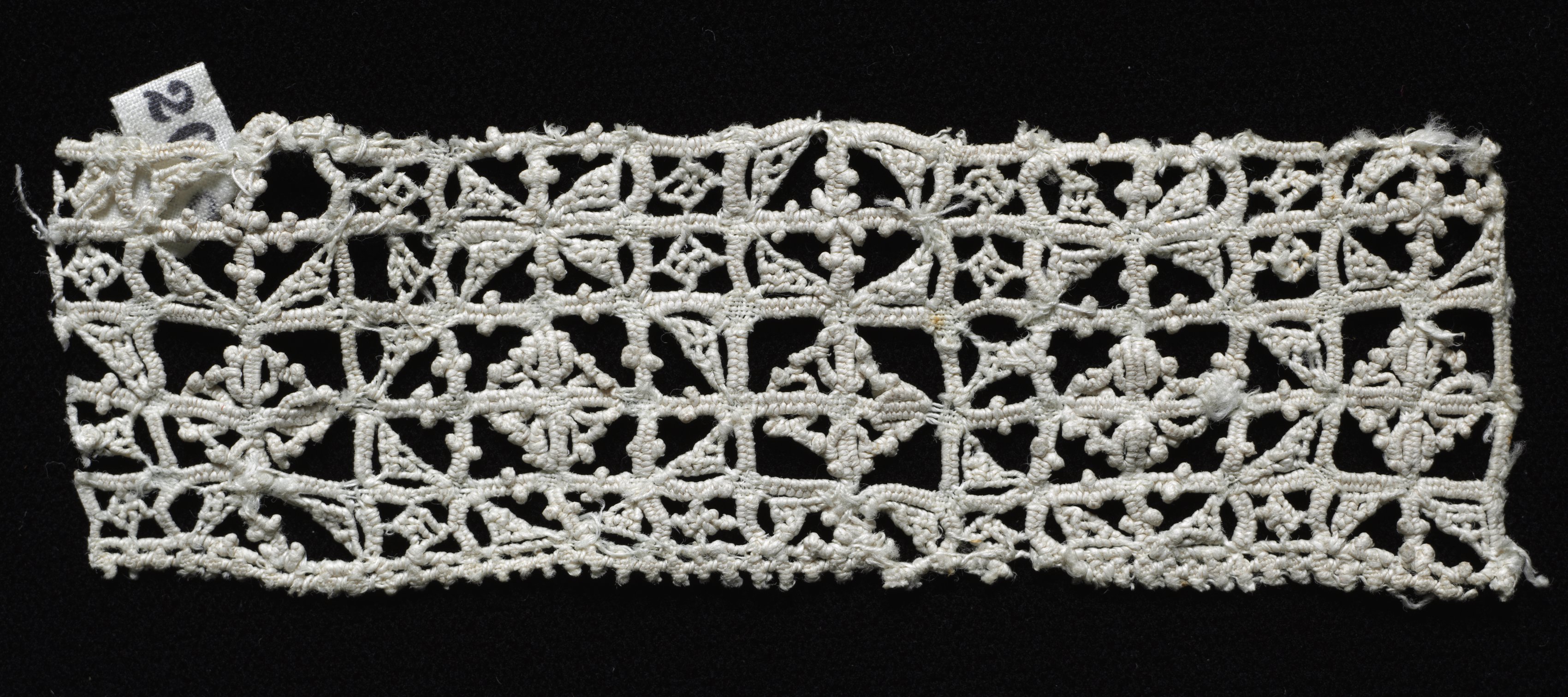 White lace with a repeating pattern of floral and leaf shapes on a black background. The lace is long and rectangular with a wavy top edge and a scalloped bottom edge. The lace is made up of rows of interconnected loops and stitches. The loops and stitches form a grid-like pattern with floral and leaf shapes within each square of the grid. The floral and leaf shapes are intricate and detailed, with many small loops and stitches. A small white tag with a black number "22" is attached to the top left corner of the lace.