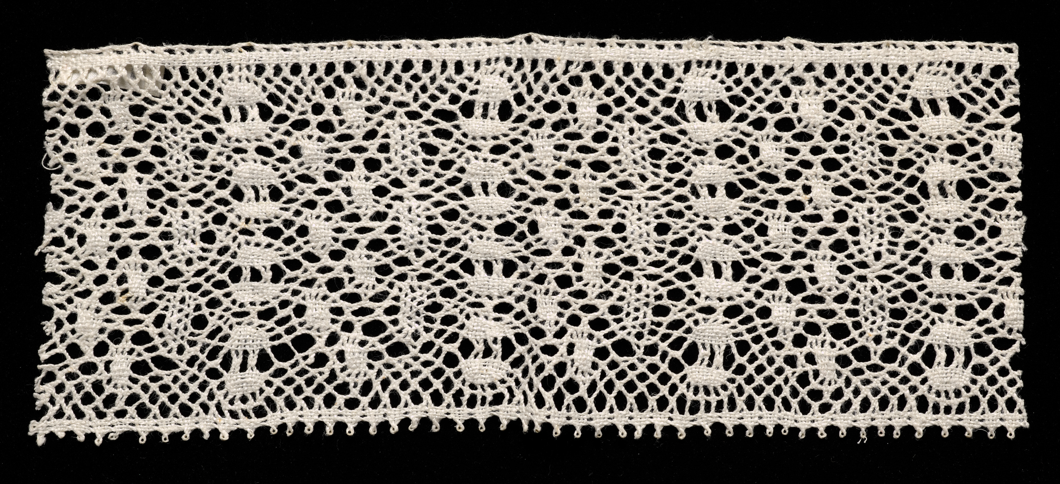 White rectangular piece of bobbin lace with intricate floral and leaf patterns, featuring a repeating design of four-petaled flowers with rounded centers and curved stems, surrounded by interconnected oval shapes. The lace has a scalloped edge along the bottom with small rounded loops and a simpler, more uniform pattern along the top edge. The background is solid black. Title: Bobbin Lace Insertion Artist: Unknown.