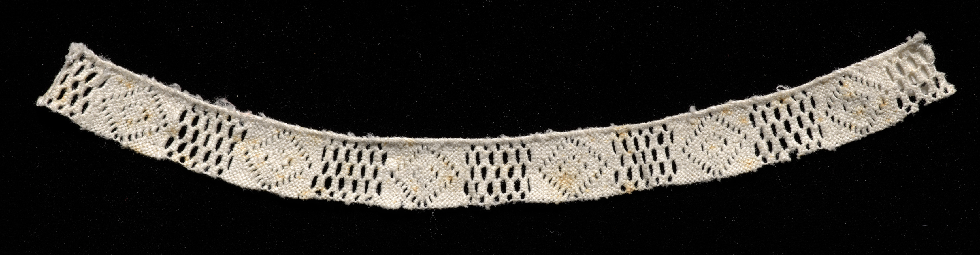 White lace piece with a repeating pattern, curved and slightly frayed edges, on a black background. The lace is made of a white thread and features a series of interconnected oval shapes with a mesh-like texture. The oval shapes are arranged in a repeating pattern, with each one featuring a central cluster of threads surrounded by a series of concentric loops. The mesh-like texture is created by a series of small holes and loops that are woven together to form a intricate design. The lace piece is curved, with the edges slightly frayed and rough to the eye. The background of the image is solid black, providing a stark contrast to the white lace. The lace appears to be a type of needlepoint lace, specifically an example of Punto Avorio or Ivory Stitch lace.